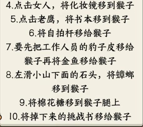 7、需先把工作人员的豹子皮转交给猴子,接着再把金鱼交给猴子。