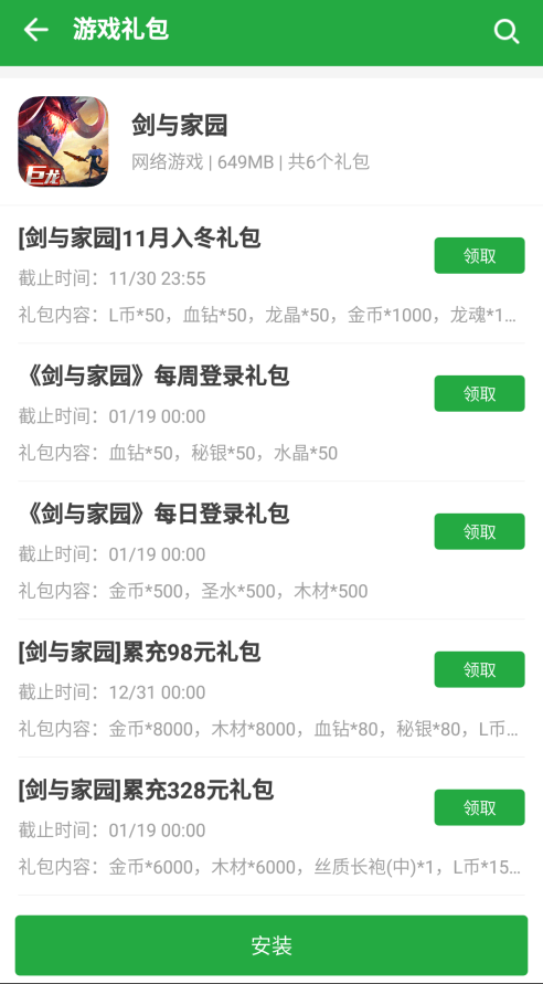 豌豆荚目前正在派送的游戏礼包包含11月入冬礼包、每周登录礼包、每日登录礼包等,想要获取更多礼包可前往剑与家园礼包专区领取。