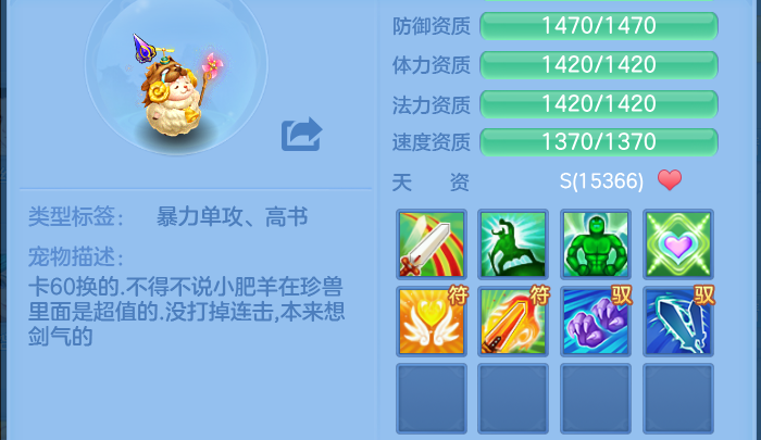 当然,如果只是想玩59级不参与打架,或者想在排位赛里取得不错的成绩,在自身已有宠物基础的前提下,搭配一只珍兽也挺实用的——比如用小肥羊当单攻、兔乖乖做隐追都是可行的。所以对低等级玩家而言,选珍兽还是神兽其实主要看玩法需求:要是佛系单机玩家,两者都能选;但如果是喜欢打架的少主,那肯定优先选神兽。