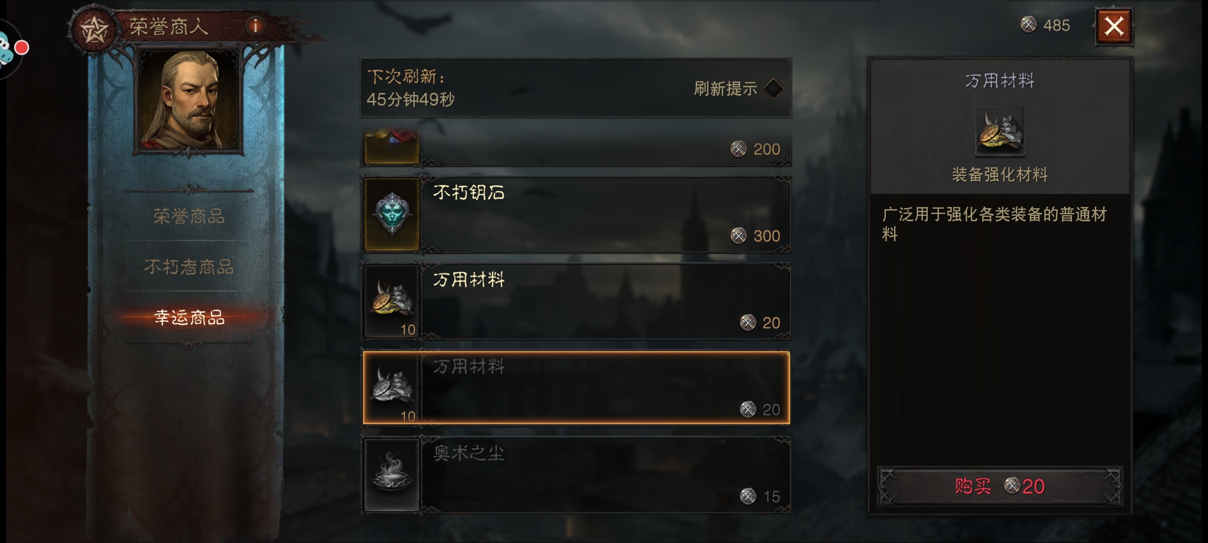 荣誉是游戏内的一种道具,玩家可通过参与各类玩法获取,并用它兑换多种稀有物品,具体可参考下图;此外游戏内设有幸运商店,该商店每日会刷新2次,每次刷新都有几率出现普通宝石、不朽钥石、洗炼石、简易护身符等物品,且每种物品限购1个。