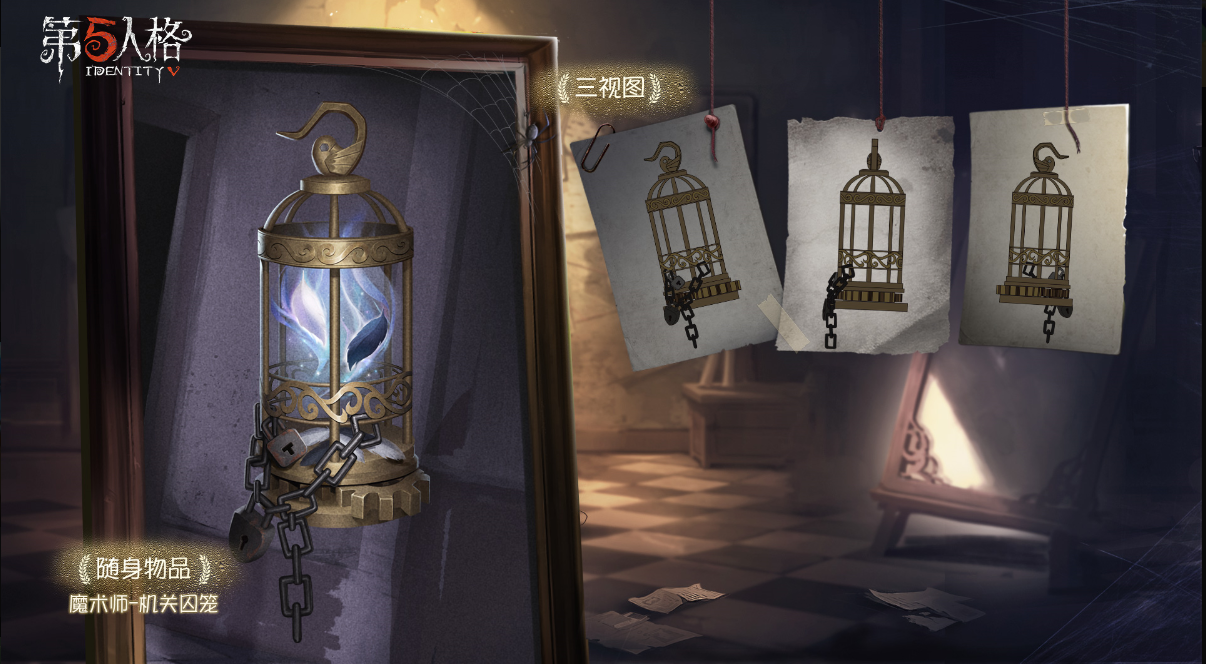 首先要介绍的是魔术师的随身物品——机关囚笼。作为魔术师这一角色的奇珍随身物品,官方在设计上颇为用心。机关囚笼的主体是古铜色的笼子,笼中关着的是散发蓝色光芒的树叶;笼子下方,锁与锁链安静地置于笼外,看守着笼内的物品;而在笼子与底座之间,两个齿轮正等待着派上用场的时刻。