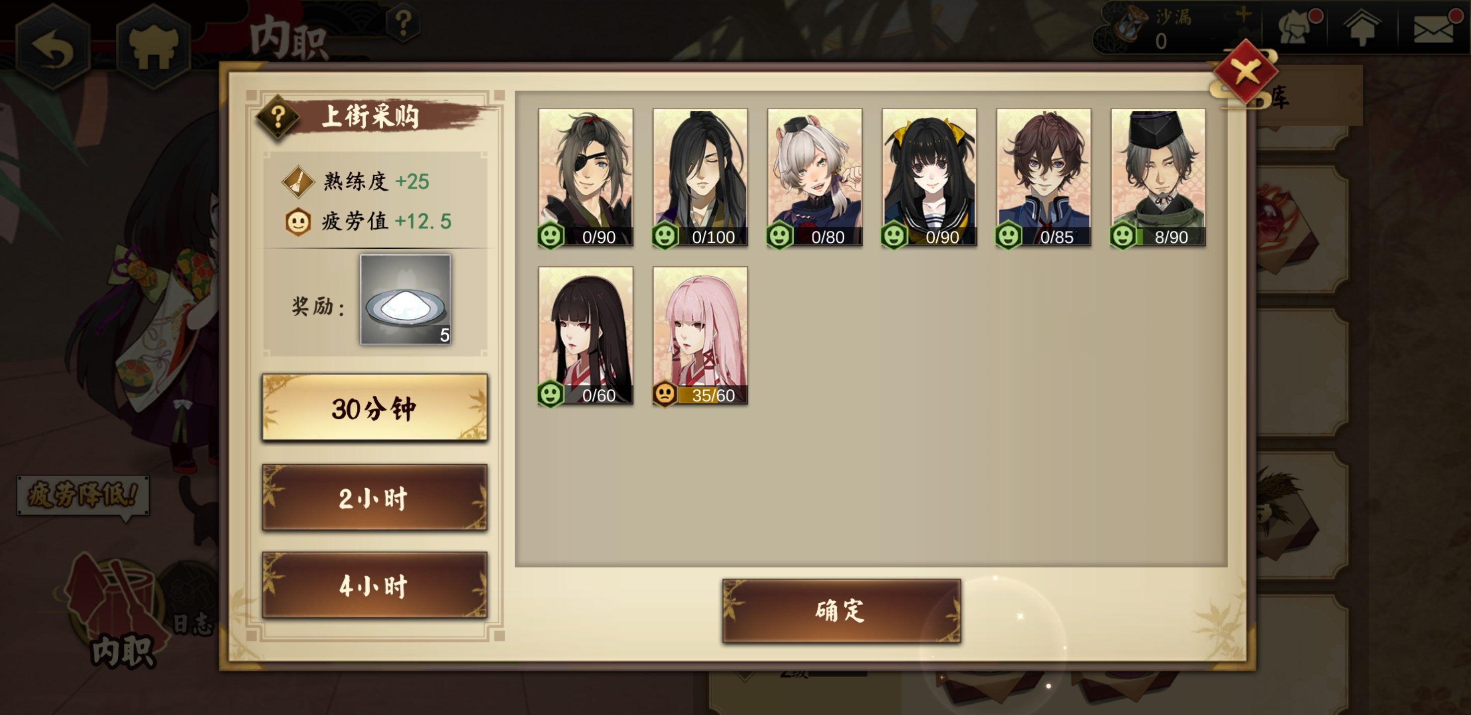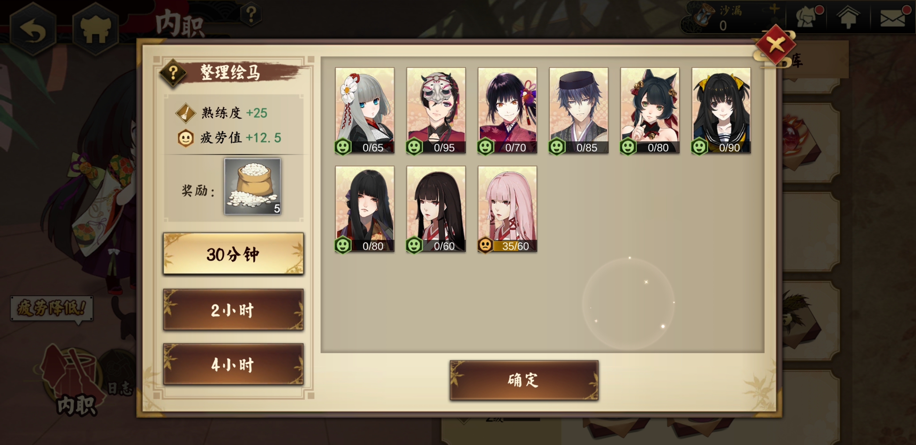 注意:内职任务最多可同时进行四个,不过这需要玩家满足两个前提条件——一是点亮本阵星愿里的所有内职绘马,二是玩家等级达到二十五级。