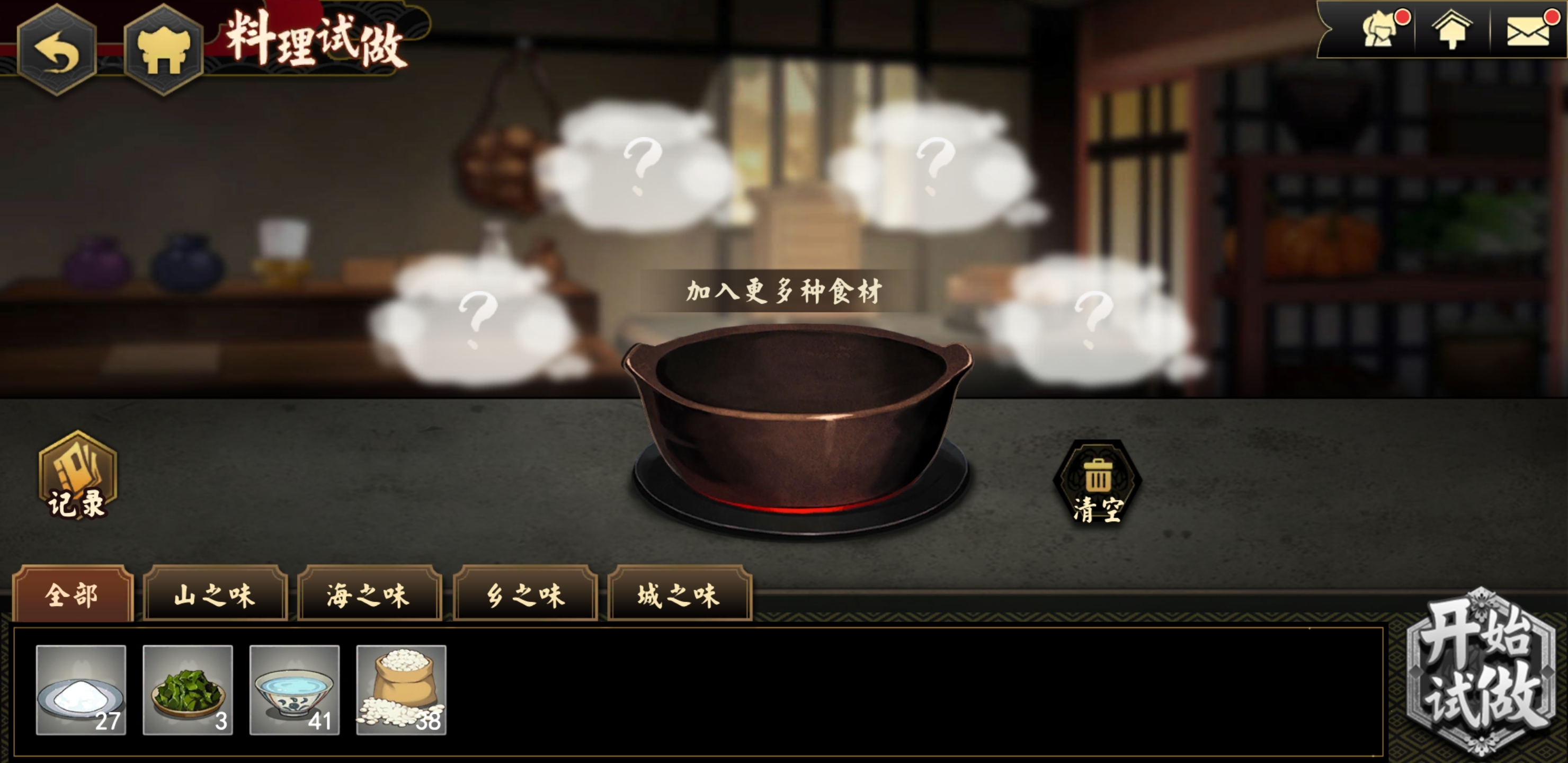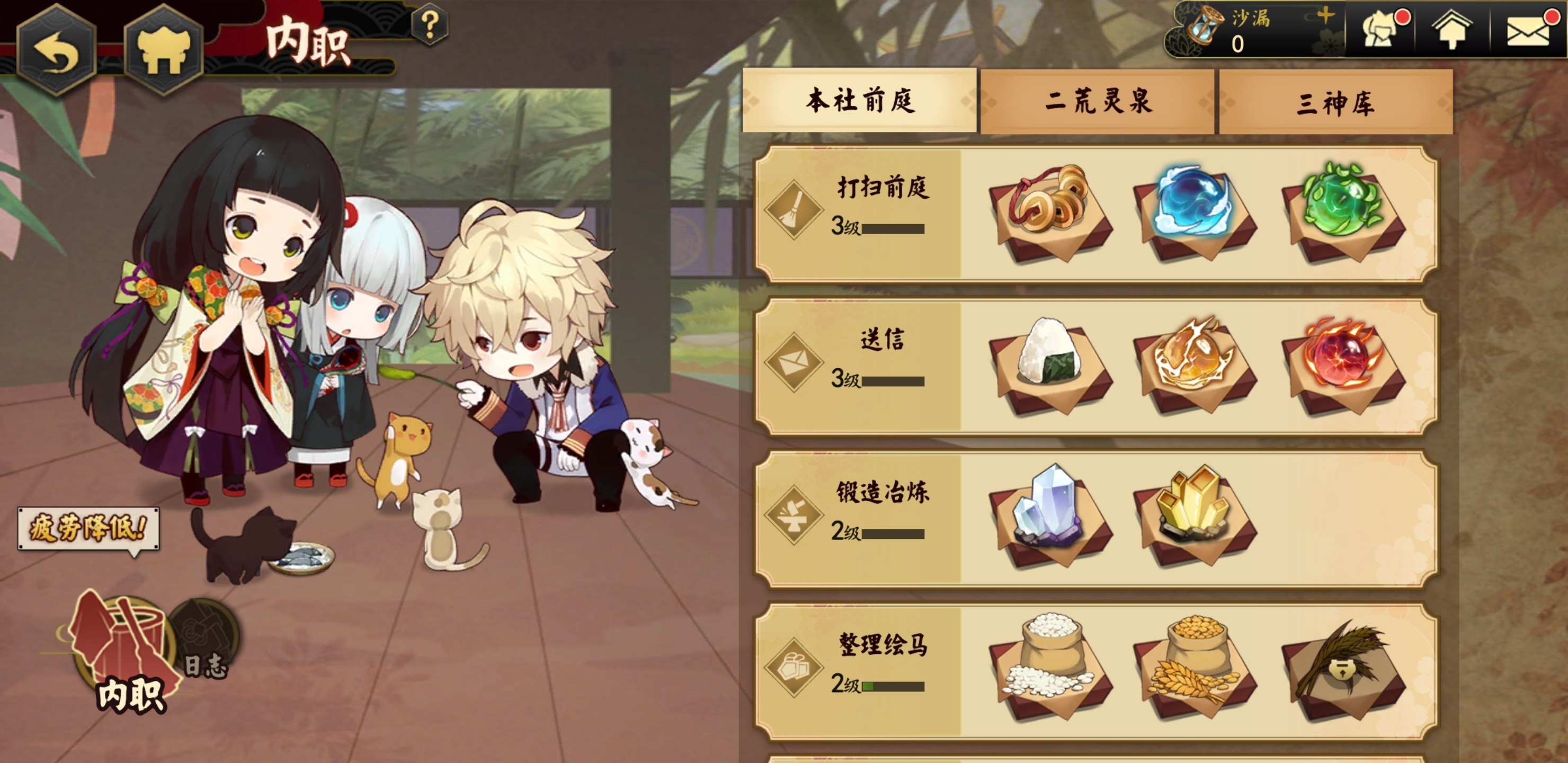 在内院里,所有的內职任务都能得到食材奖励。比如打扫内院可以获取红豆和黄豆,清扫浴池则能得到泉水和蜂蜜。