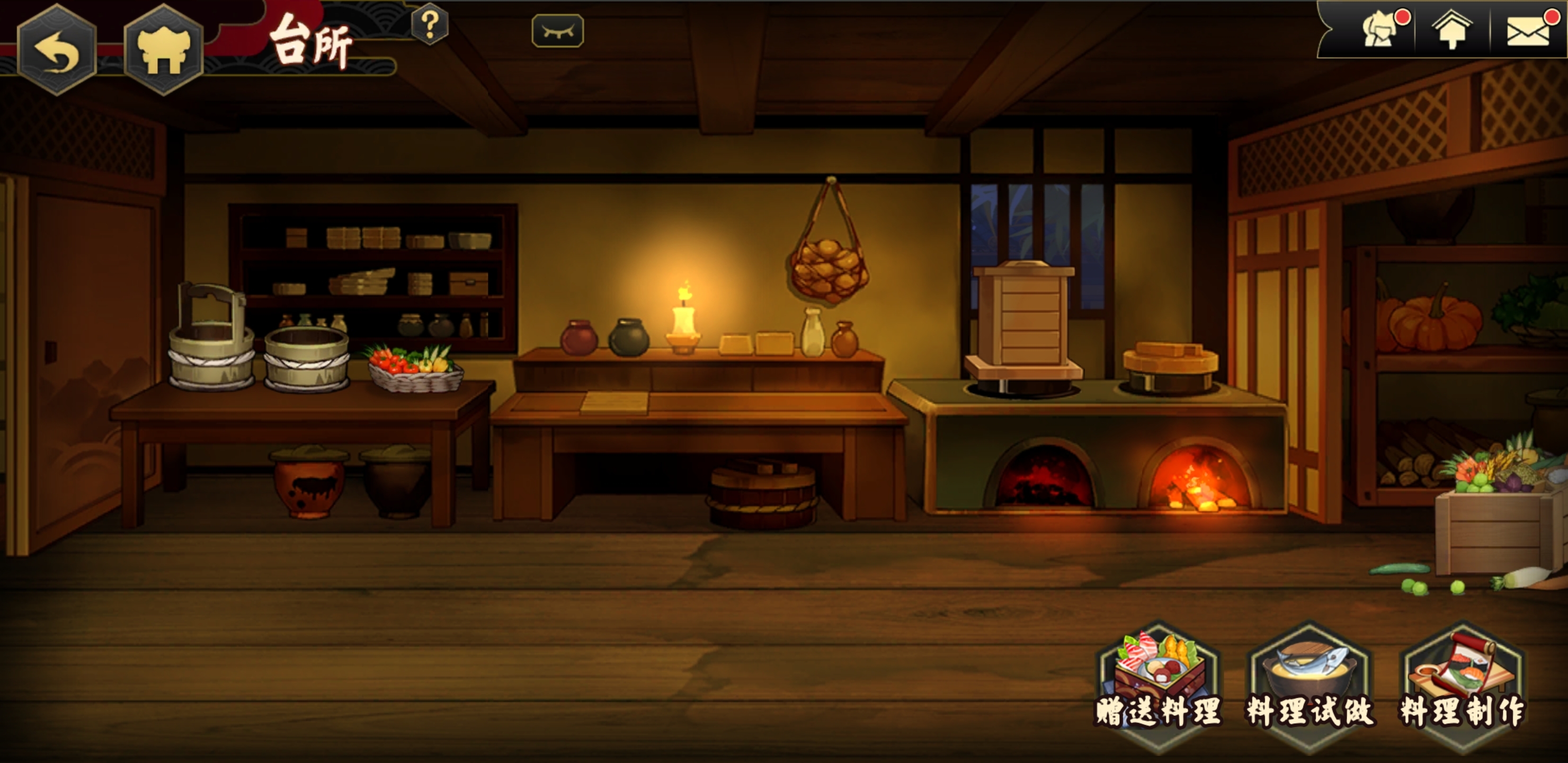 玩家收集齐食材后,可前往本阵里的台所(即厨房)制作各式美味料理,能做的料理包括点心、炸物、煮物以及活动限定料理;在正式制作料理前,玩家还能先进行试做,以此获取料理制作单。