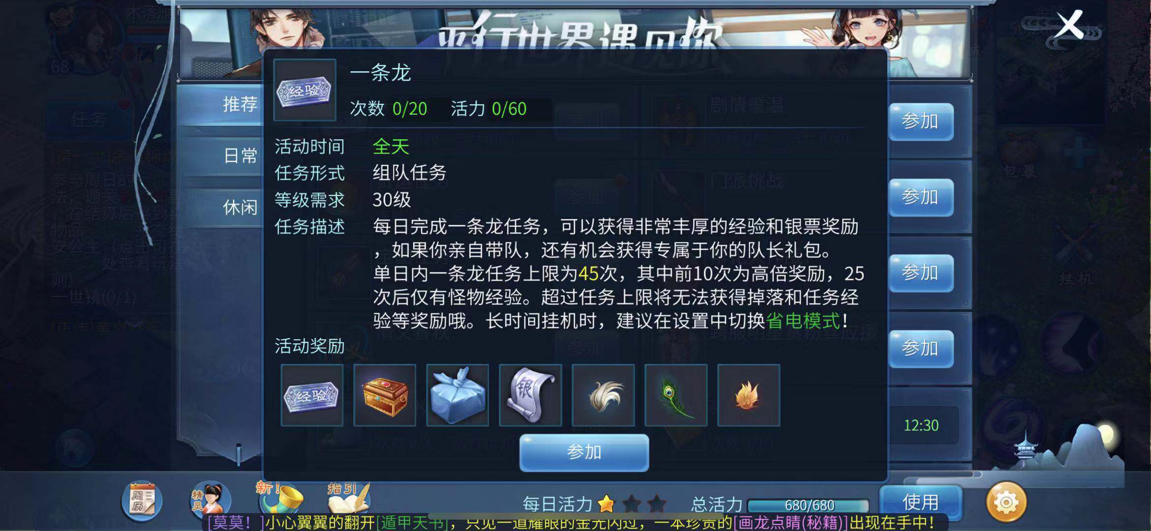 除了通过师门任务获取活力值,一条龙任务同样是获取活力值的途径。在活动页面可以看到,一条龙任务每日可为玩家提供六十点活力值,玩家一天最多能参与四十五次一条龙活动,但只有前二十五次能获得任务经验奖励,且仅前二十次会产出活力值——这意味着前二十次一条龙任务中,每次任务可固定获取三点活力值。因此小编建议,玩家每天完成二十五次一条龙任务即可,其中前二十次都能稳定拿到活力值。