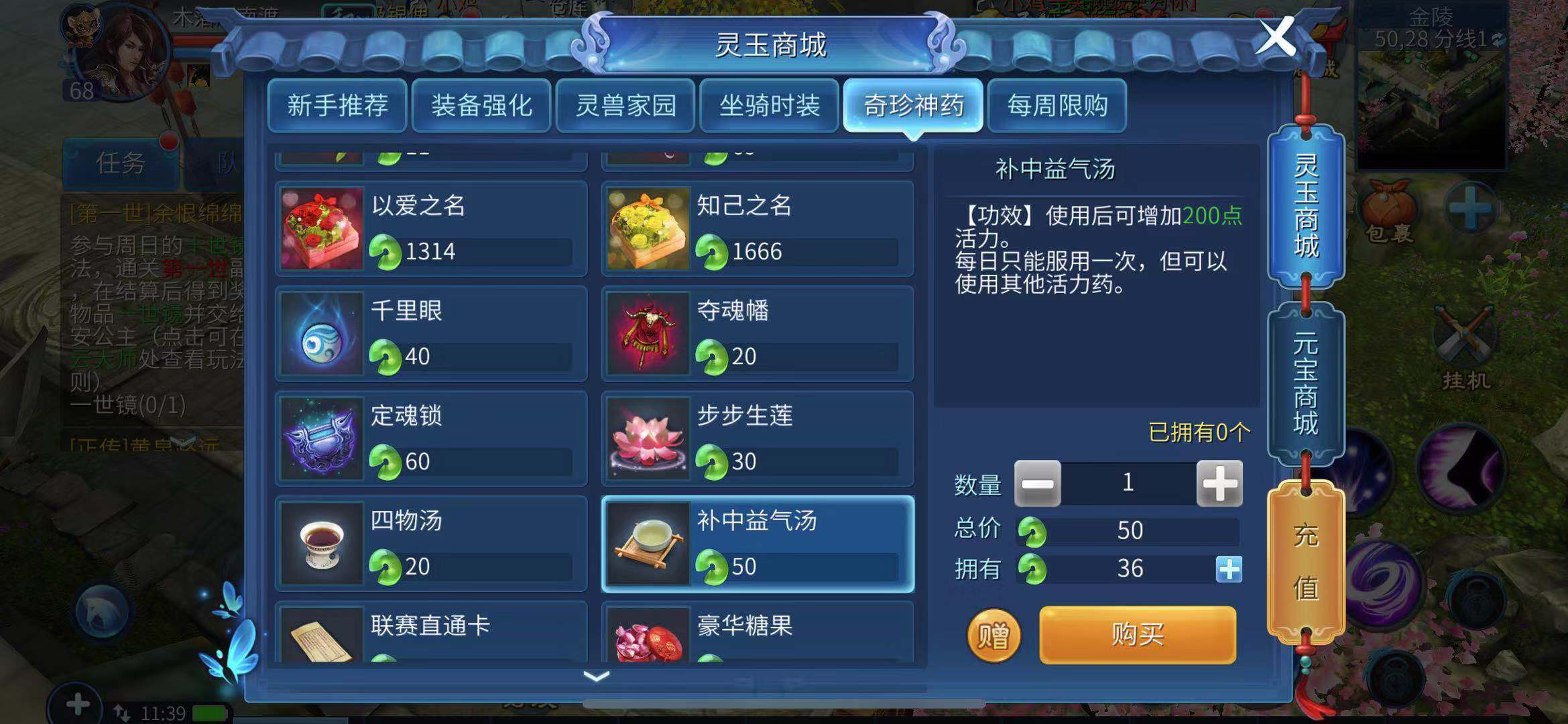 要是上述途径都没法满足玩家对活力值的需求,大家还能消耗一定数量的灵玉与元宝,去商城的药物分类中选购专门提升活力值的药品。这类药物每使用一次,就能为玩家增加几十点活力值,不过它有使用次数限制,玩家们可得好好规划使用时机哦!