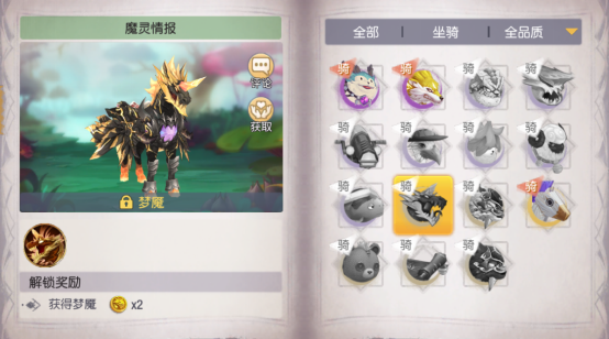 首先要跟大家说明的是,魔灵坐骑的获取途径是比较多样的。有些是通过推进剧情任务由系统免费赠送的,有些需要达成副本的通关要求才能得到,还有些得参与特定的限时活动才有机会获得,另外也存在需要充值才能获取的类型。