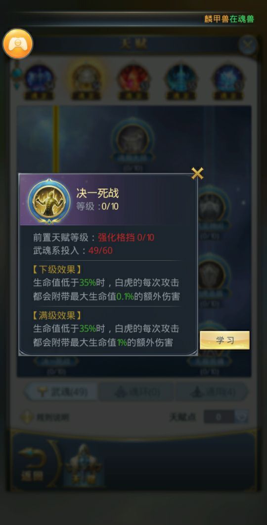 以上是白虎通常的天赋加点情况,因为玩家在达到魂宗后每升一级才可以得到一点天赋点,所以天赋加点是漫长的过程,玩家可以根据自身情况进行加点。