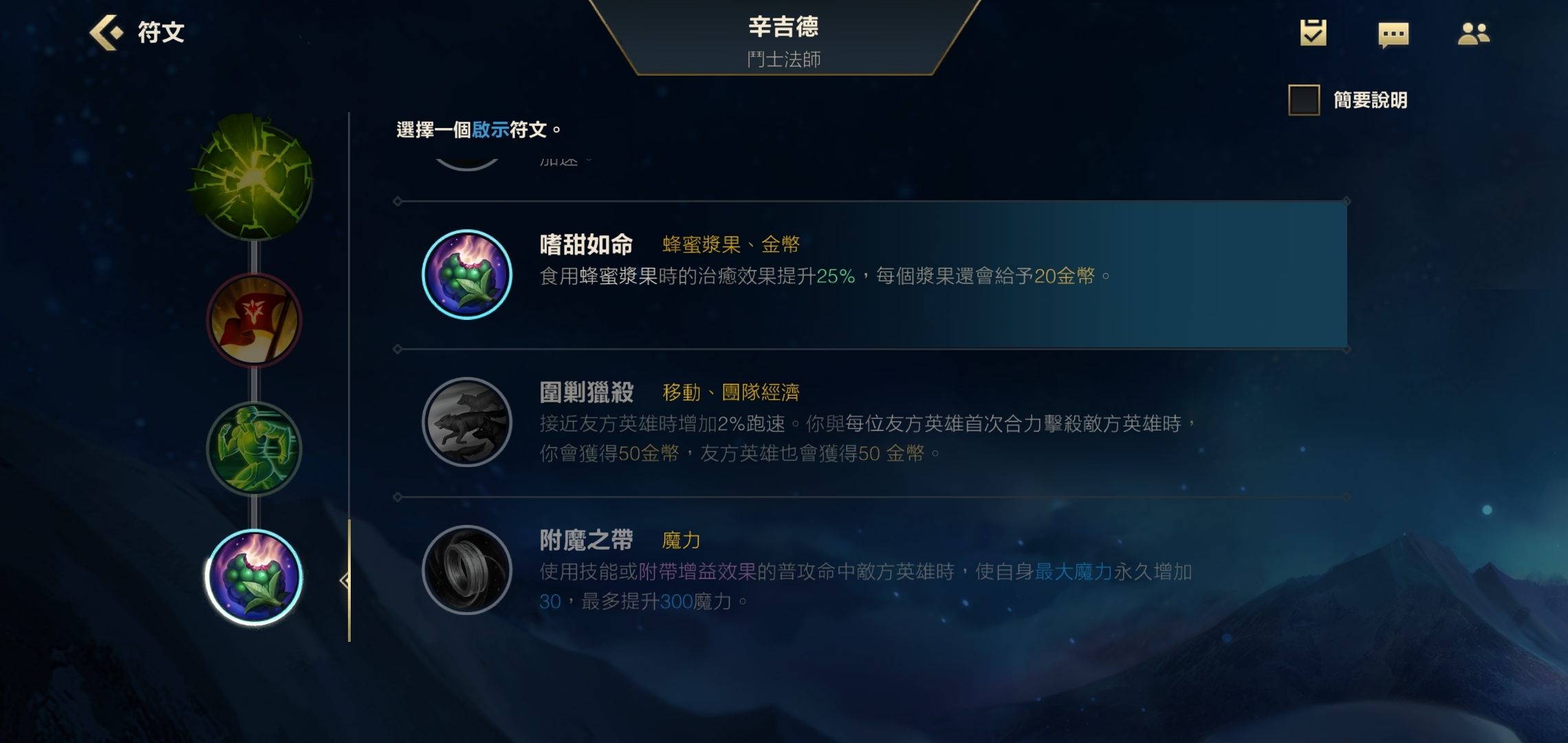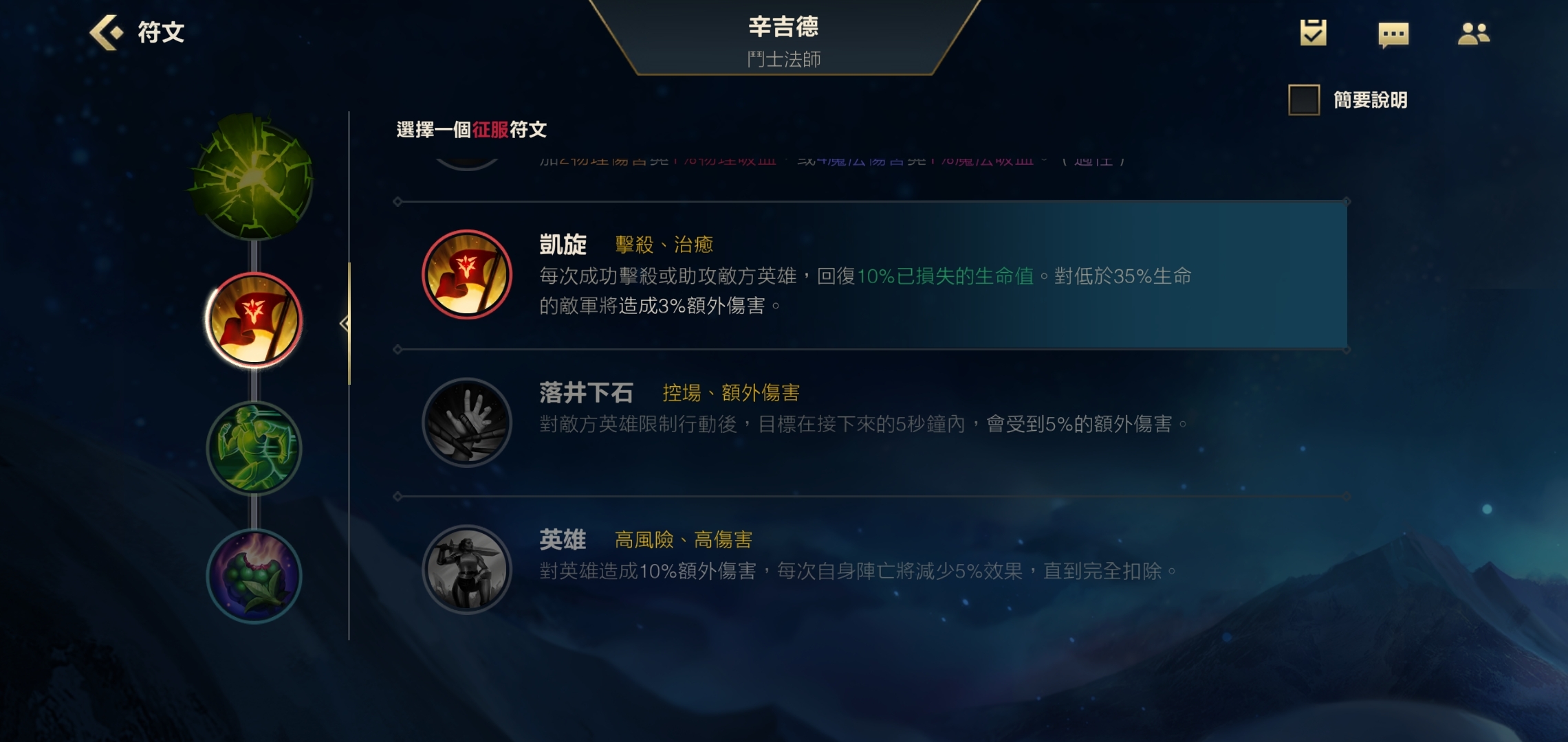 副系的首个天赋我们选择凯旋,该天赋能让我们在击杀或助攻英雄后,回复已损失生命值的10%,在团战里是个实用的续航型天赋。