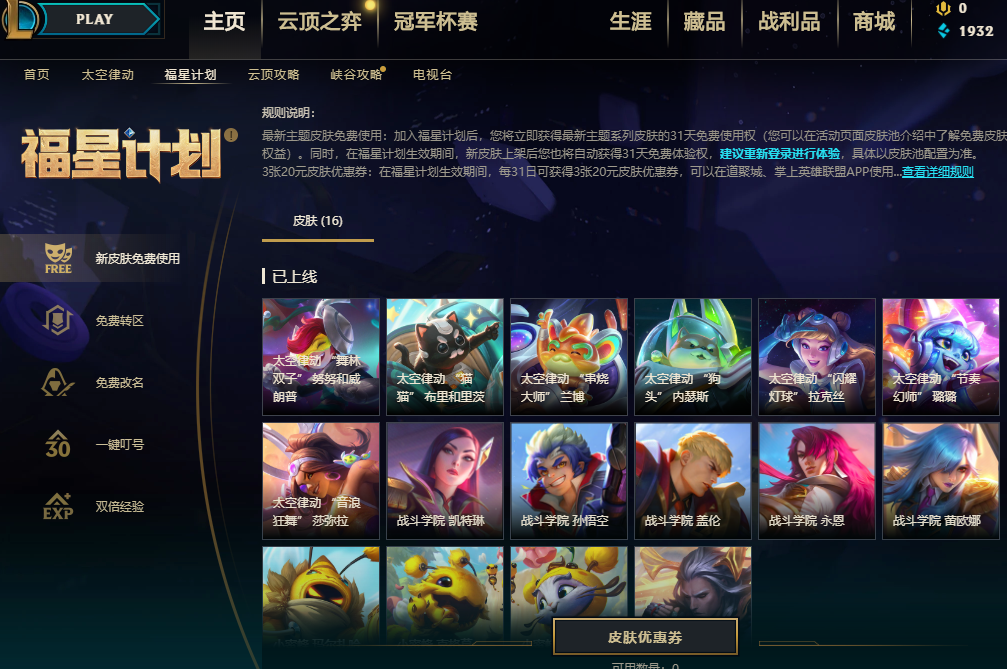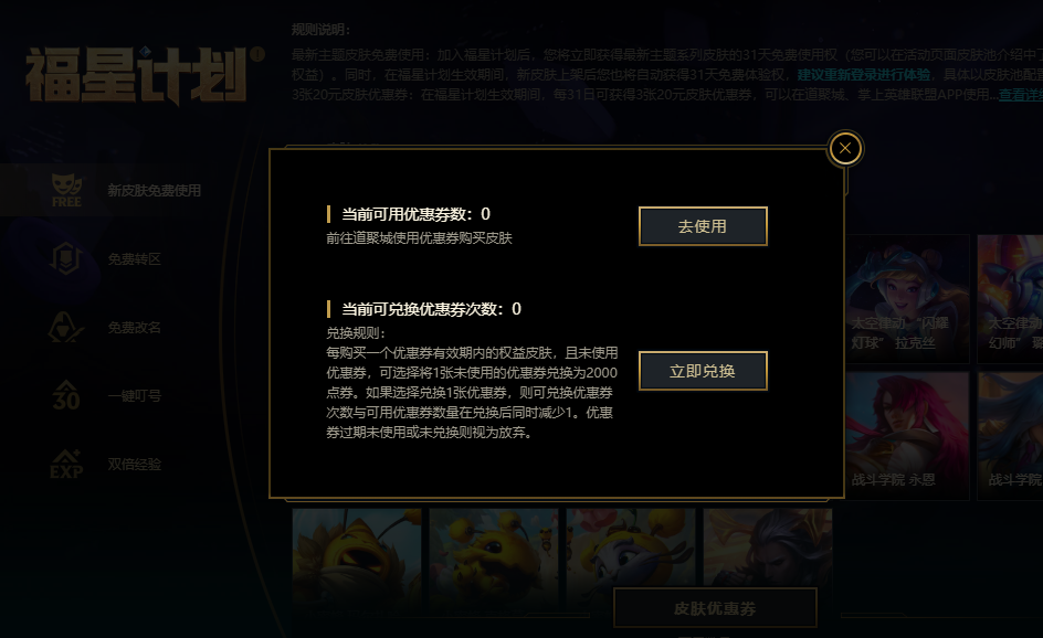 想要免费使用新皮肤这个功能,得先在福星计划里找找。福星计划本质上是个月度付费活动,只要每月按时支付固定费用,就能享用其中的各类功能。所以我们得先打开福星计划的页面,点击参与该计划,这样才能继续后续操作。