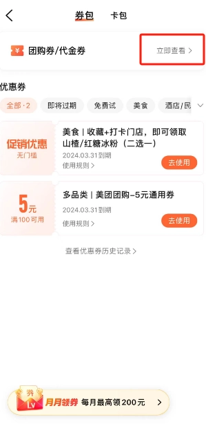 2、接着在团购券或代金券选项后方点击“立即查看”。