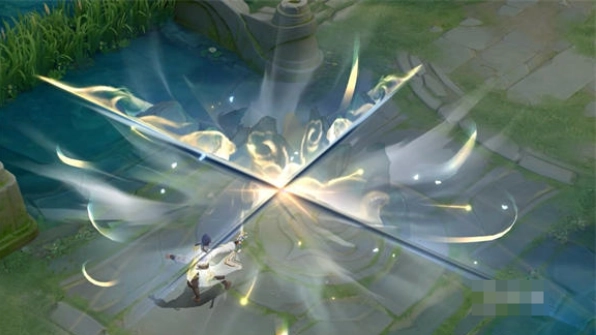 5、三技能:李白执剑挥洒,一幅山水画卷裹挟着剑气汹涌而出,凌厉的剑光如疾风般向四方穿梭。