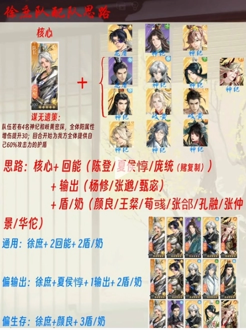 生存偏向的阵容:围绕徐庶构建,加入颜良,同时搭配三名防护或治疗类型的武将,以此保障队伍具备持久的战斗能力。
