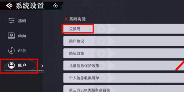3、进入系统设置,点击左侧菜单栏里的“账户”选项,便能找到兑换码入口。
