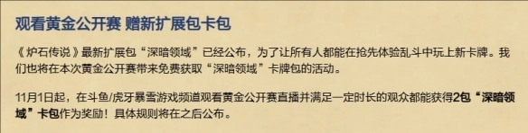 3、自11月1日起,于斗鱼或虎牙的暴雪游戏频道观看黄金公开赛直播,且观看时长达到一定要求的观众,均可获赠2包“深暗领域”卡包作为奖励!