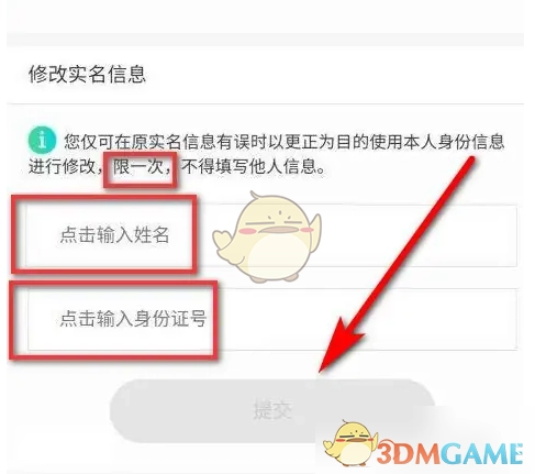 6、最后填写姓名与身份证号,点击提交即可。但需留意,仅能修改一次。