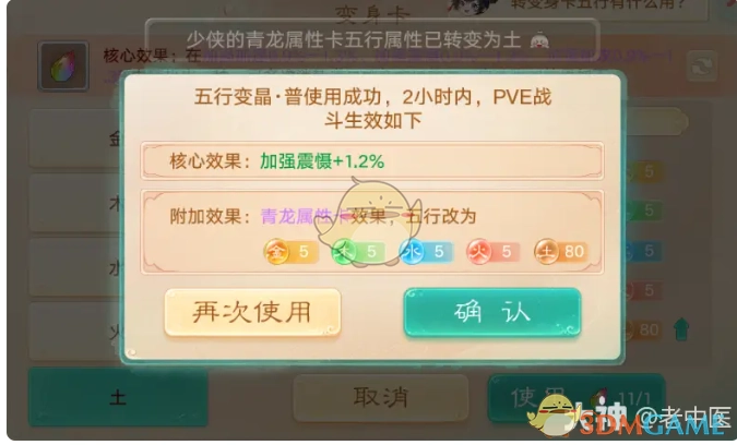 2、五行变晶:能够把属性卡的五行转换为指定五行,共分三个品阶。普品可变换80五行值,优品可变换90五行值,极品可变换100五行值。同时,还会随机获取一种本角色的强法条目。