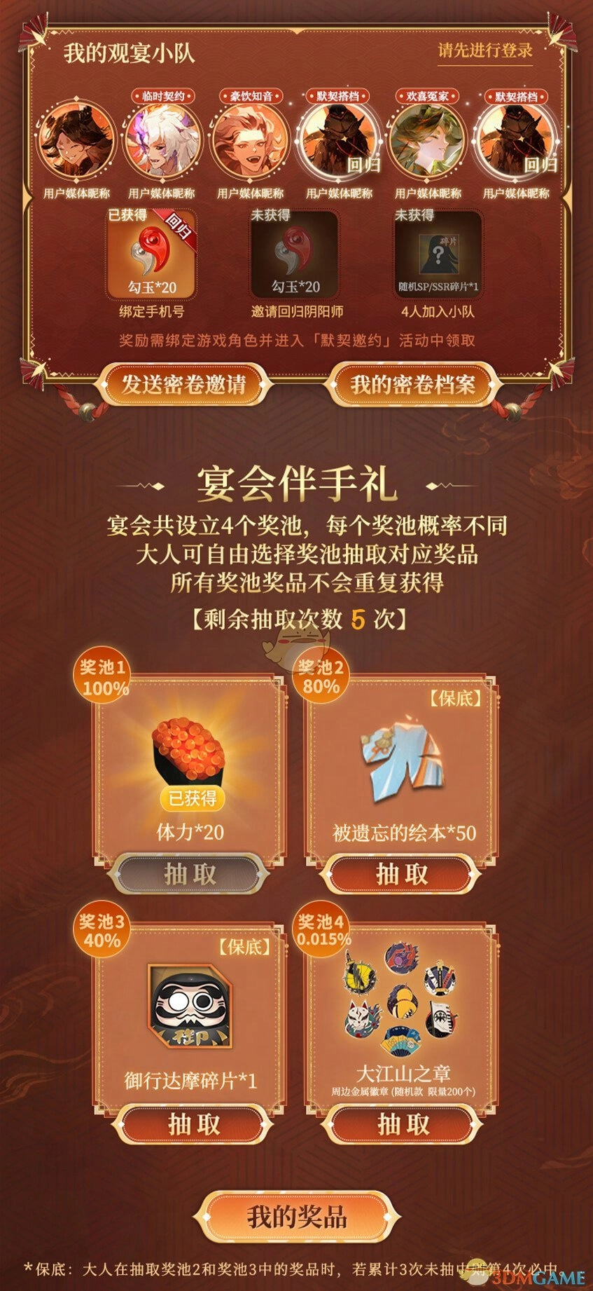 ※ “宴会伴手礼”抽奖池包含:体力×20、被遗忘的绘本×50、御行达摩碎片×1,以及大江山之章 - 周边金属徽章(随机款式,限量200个)