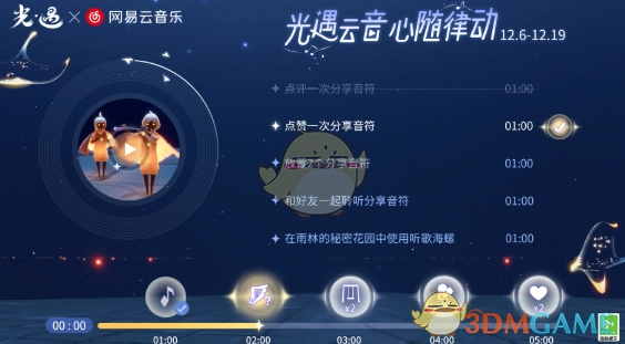 2、玩家只要参与活动,并且完成下方五个任务,即可获取一分钟听歌进度。