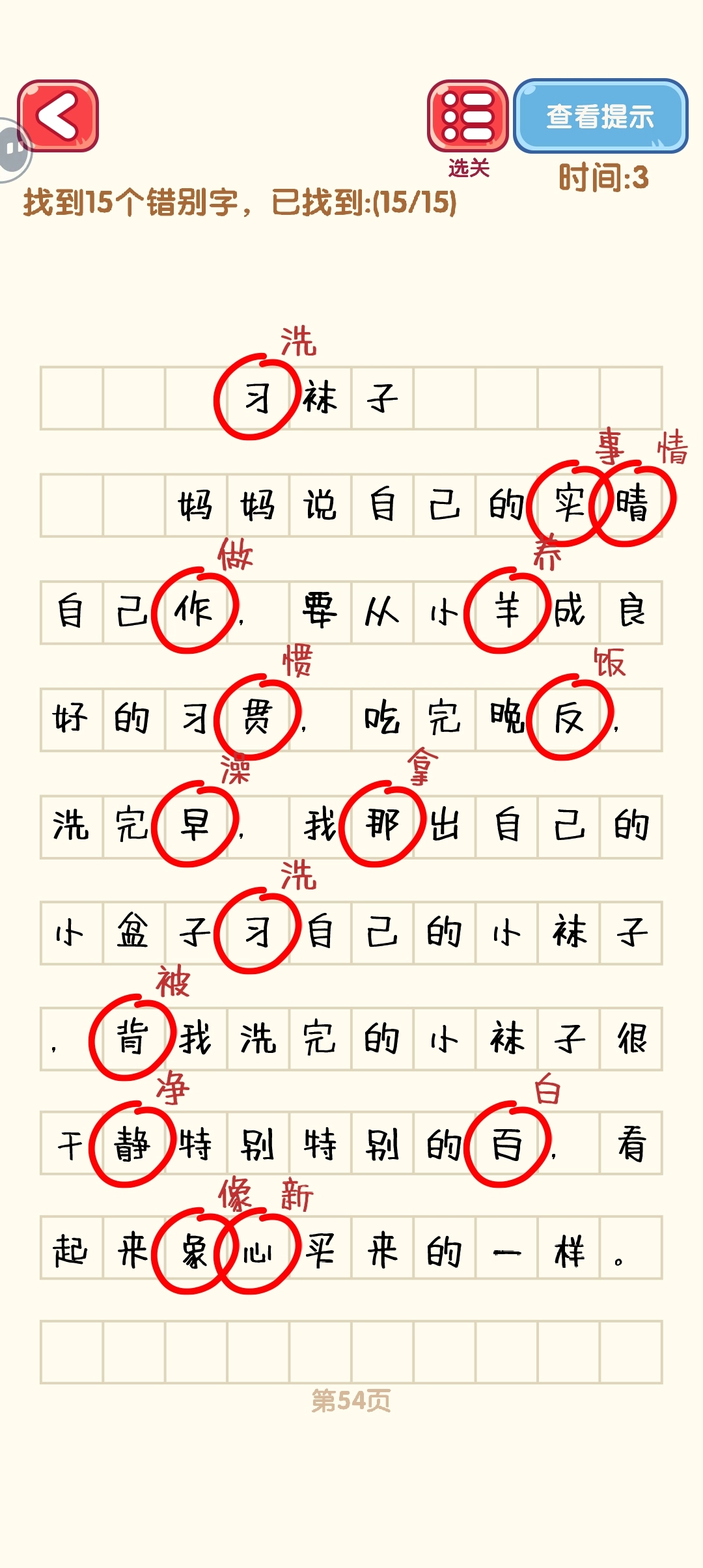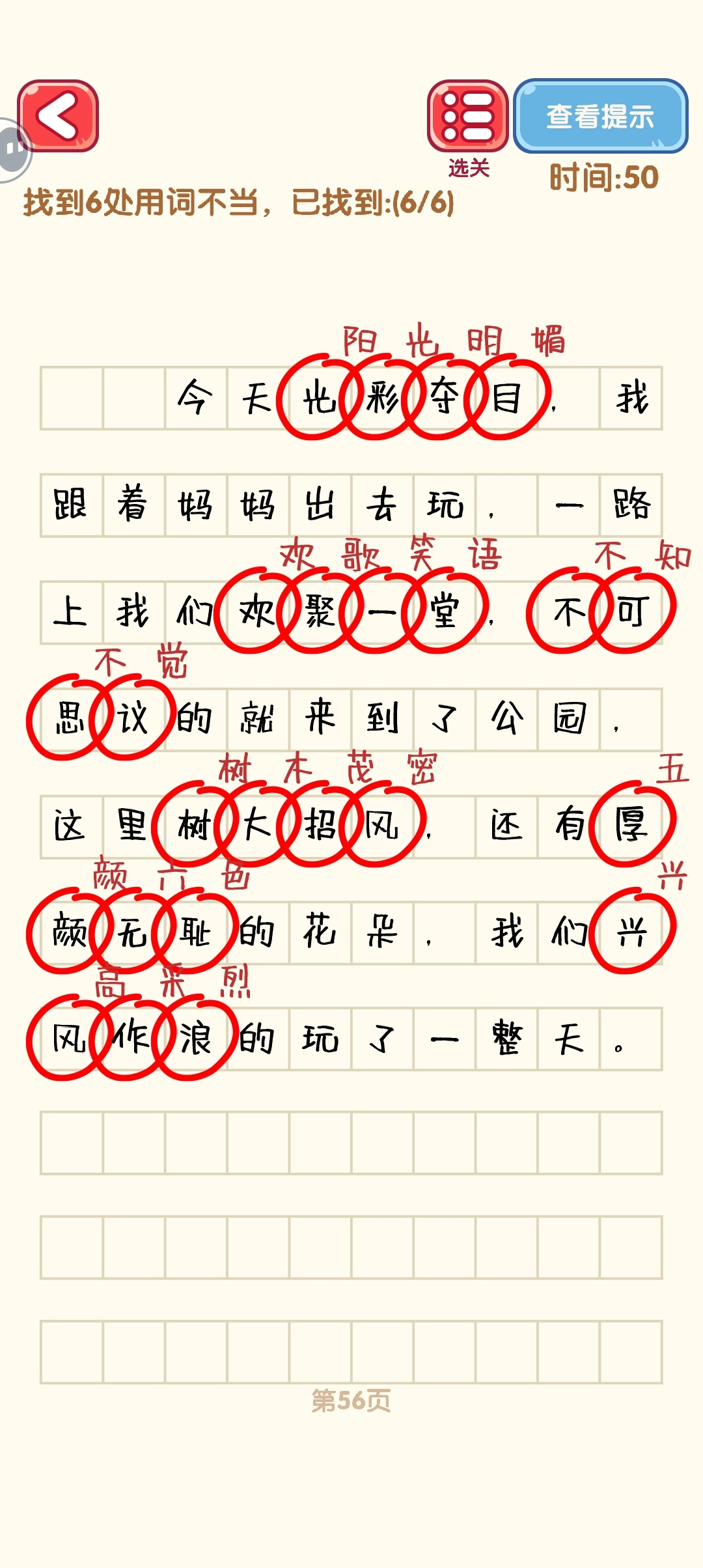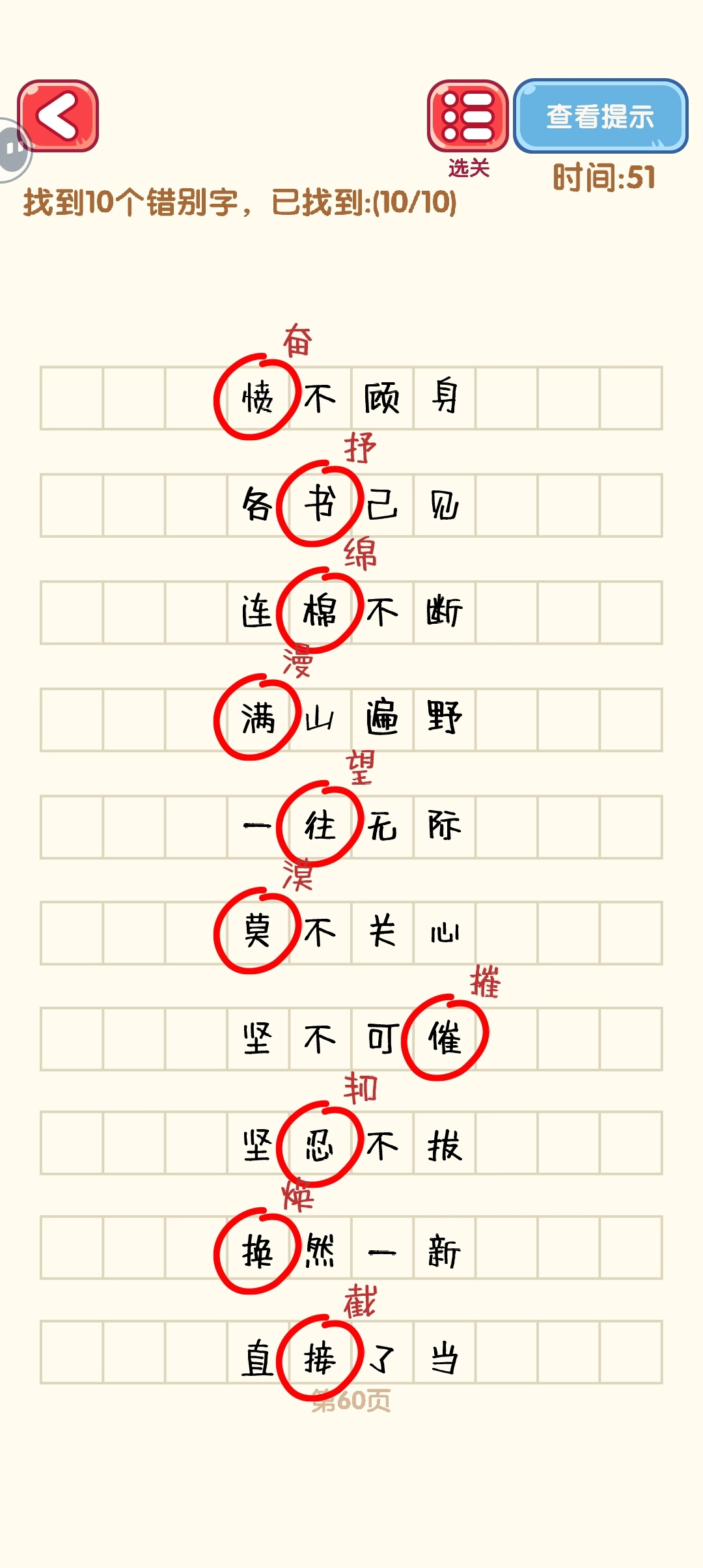《消灭错别字》51 - 60关该怎么过呢?这是一款专注于寻找错别字的休闲游戏,凭借轻松的娱乐玩法与简单操作,助力大家规避错字。游戏操作超简单,只需在给定的文章里找出错误的字就能顺利过关。下面为大家分享《消灭错别字》51 - 60关的通关攻略图,要是大家在过关过程中遇到难题,不妨来看看哦!