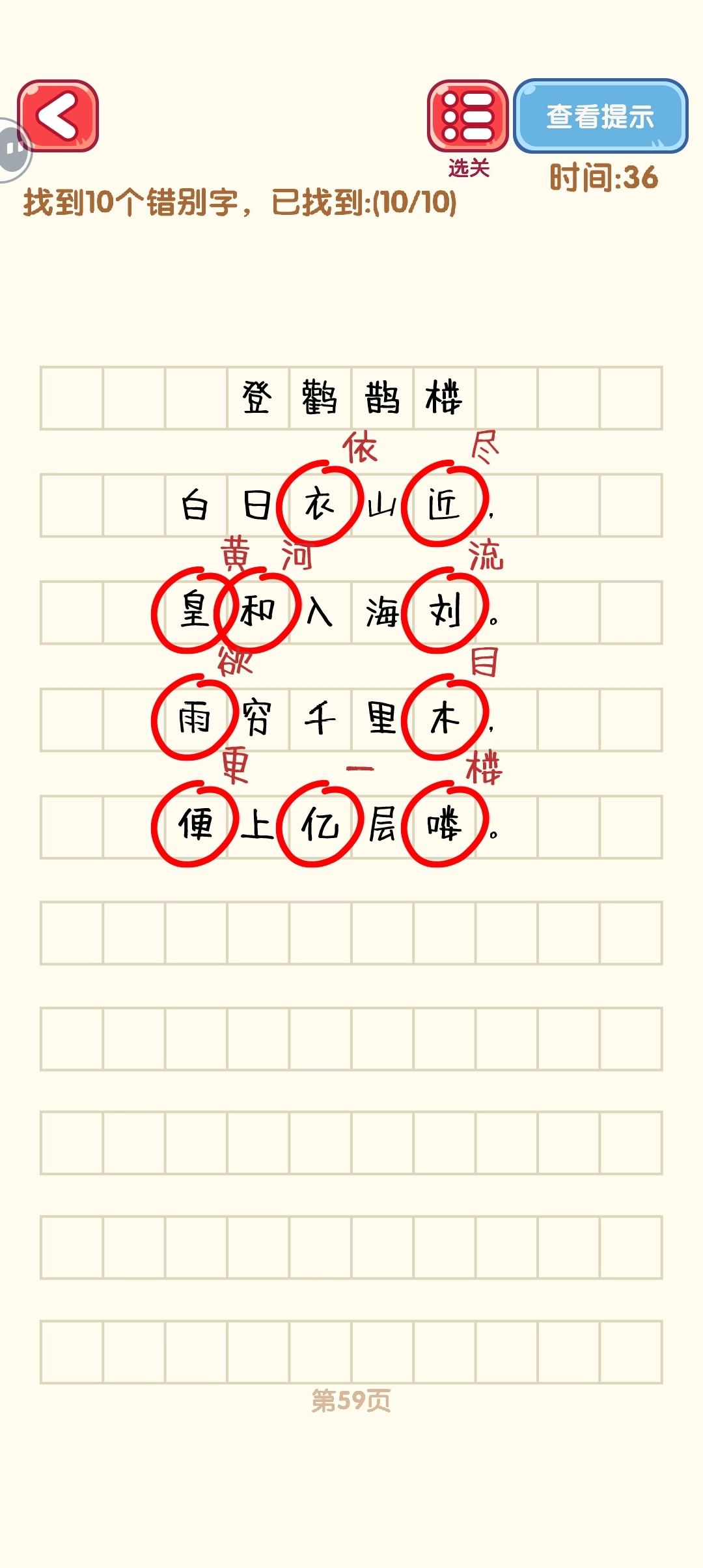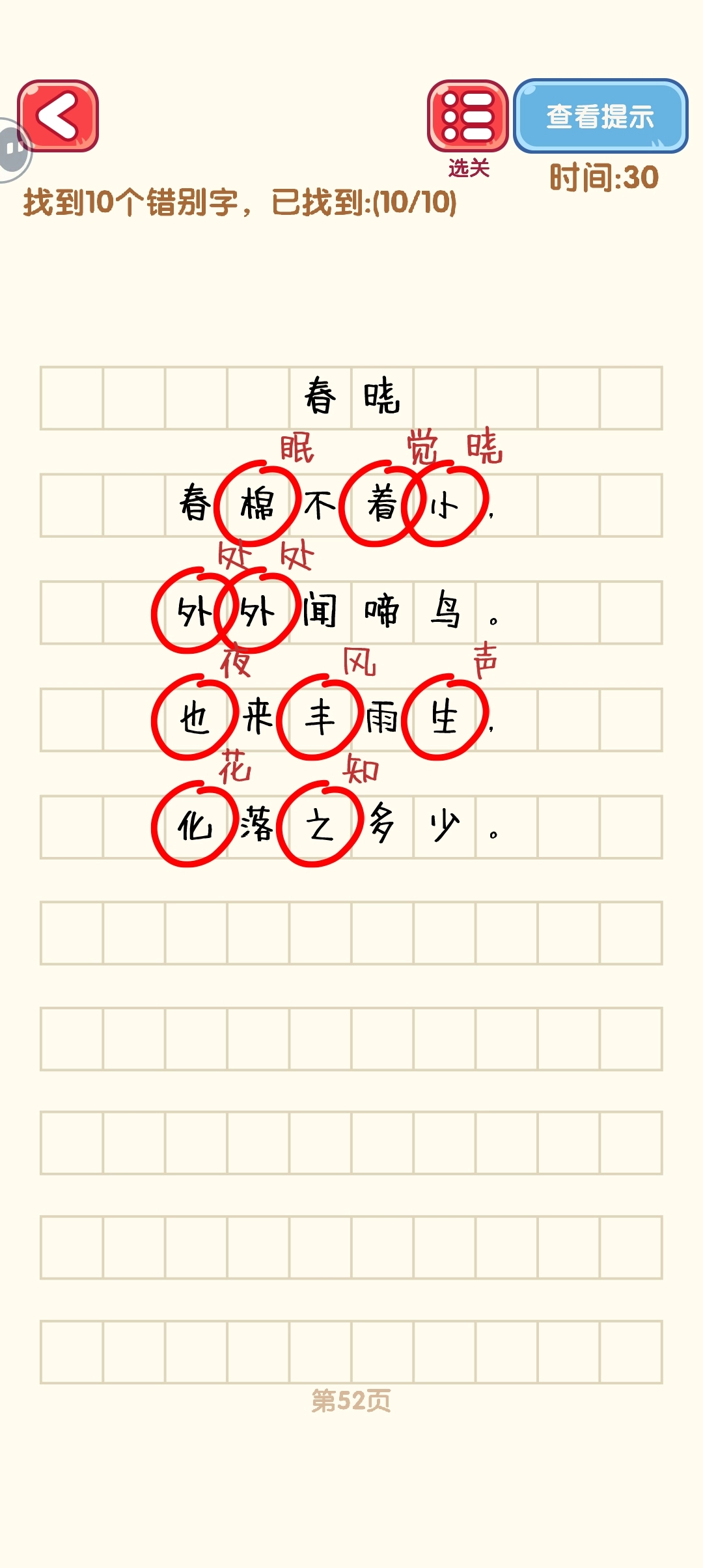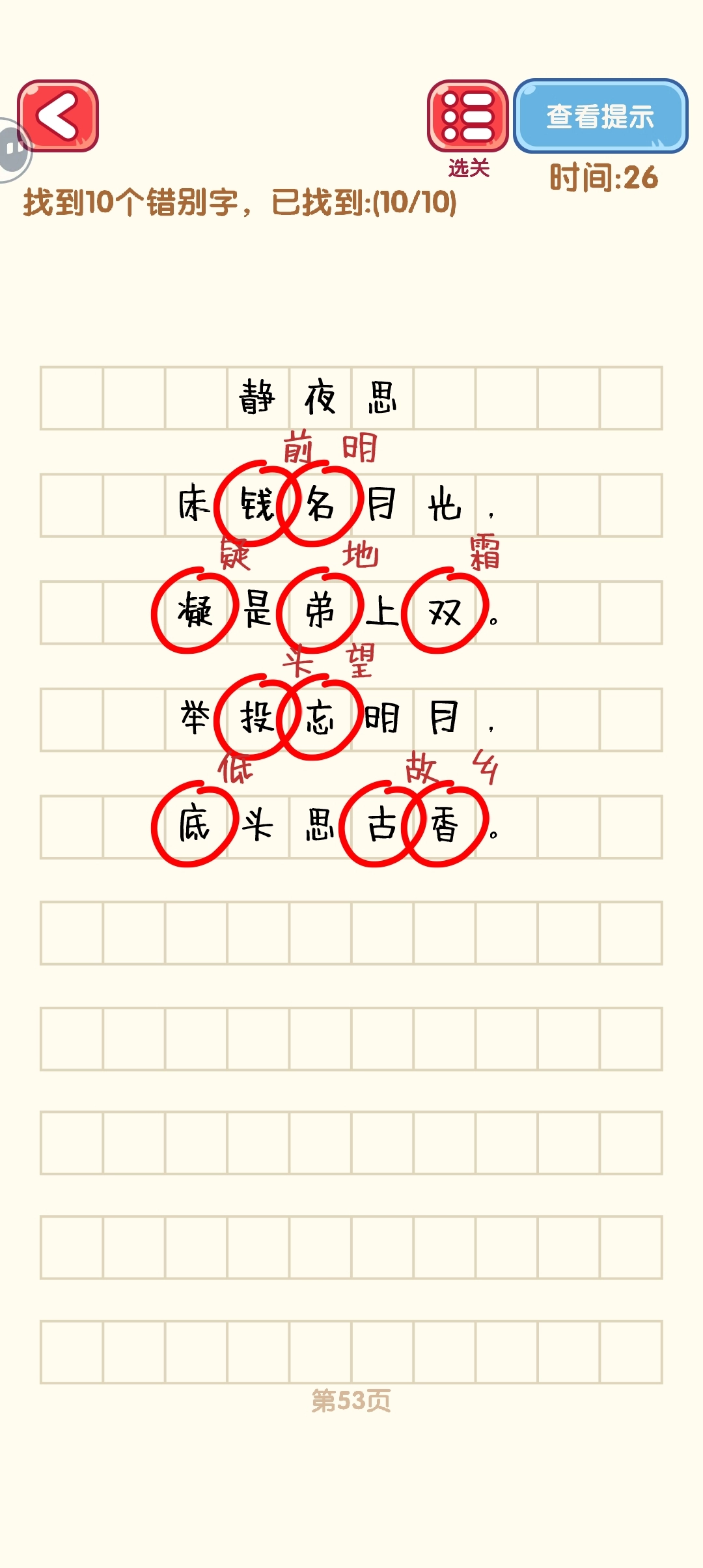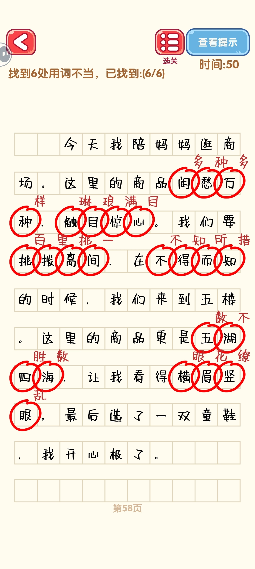 《消灭错别字》51 - 60关该怎么过呢?这是一款专注于寻找错别字的休闲游戏,凭借轻松的娱乐玩法与简单操作,助力大家规避错字。游戏操作超简单,只需在给定的文章里找出错误的字就能顺利过关。下面为大家分享《消灭错别字》51 - 60关的通关攻略图,要是大家在过关过程中遇到难题,不妨来看看哦!