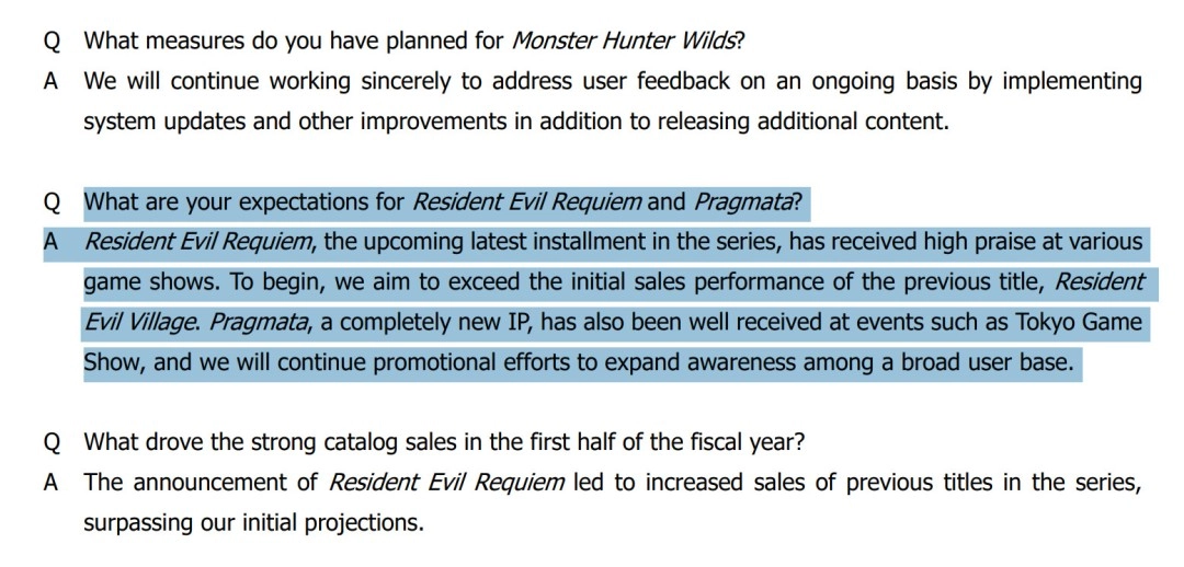在最新发布的财报QA问答环节中,当被问及对《生化危机9》以及《虚实万象》抱有怎样的期待时,Capcom回应称:“《生化危机9》在多个游戏展会上收获了极高赞誉。我们的目标是超越前作《生化危机8:村庄》的初期销售成绩。”