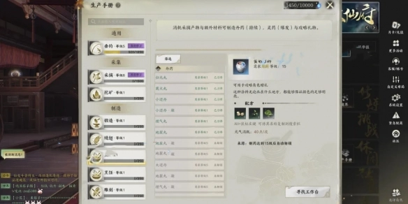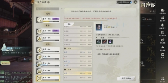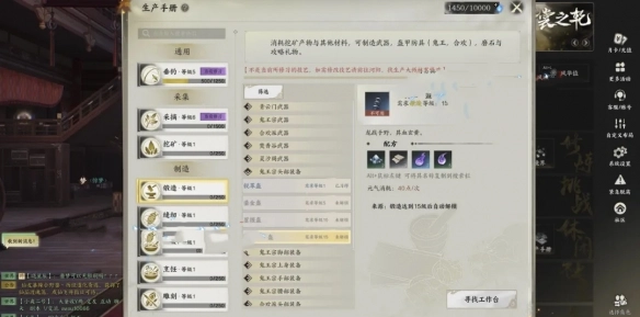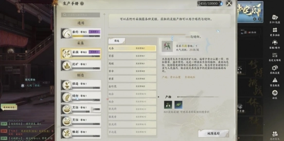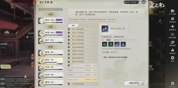 6、缝纫:制作灵汐、青云、焚香的防具,打造扩充背包的包裹,制作护甲片,以及制作用于提升NPC好感度的礼物。