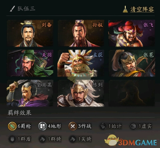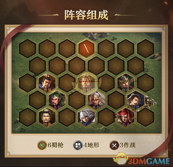 然而,羁绊中涵盖了十余名不同名的武将,可当建设达到9级且不带特殊战法的情况下,最多只能上场9名武将。因此,最终选取8名武将,组成6蜀枪 + 3作战 + 4地形的配置。
