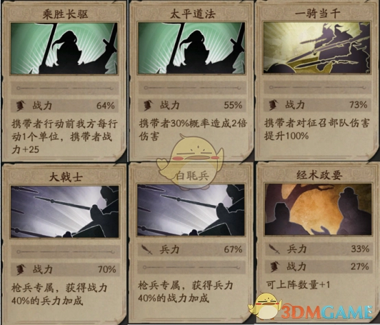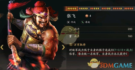 5、乘胜长驱:携带者之前每行动1名武将,携带者+25战力(张飞提升伤害)