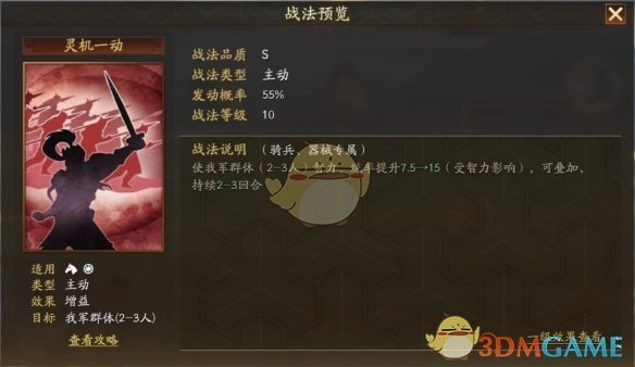 此外,有一点值得特别说明,“灵机一动”战法的加成效果会受智力加成的影响。也就是说,若你的武将智力属性偏高,所能获取的属性加成便会更为显著呢!