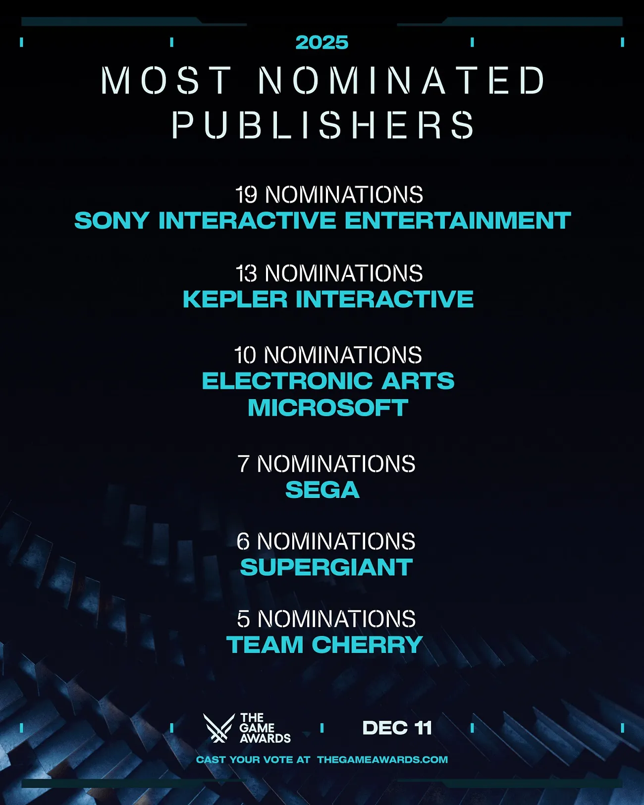 在发行商的排名里,Kepler Interactive凭借《光与影:33号远征队》获得的13项提名,位居第二。这款游戏同时刷新了TGA历史上单款游戏提名数量的记录,而EA和微软均以10项提名并列第三。