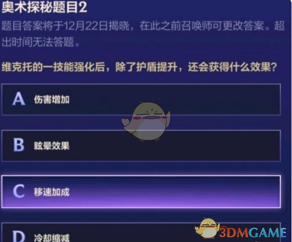 奥术探秘题目2:维克托的一技能在强化之后,除了护盾会得到提升,还会获取到什么效果呢? C、移速加成