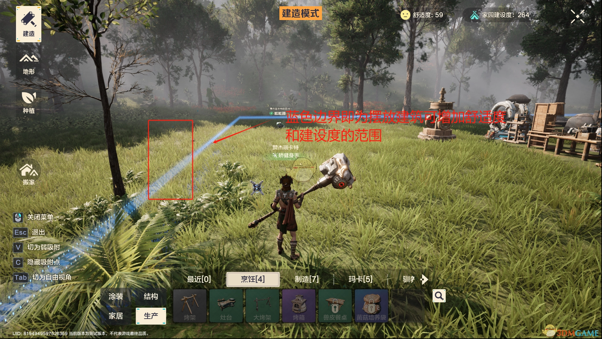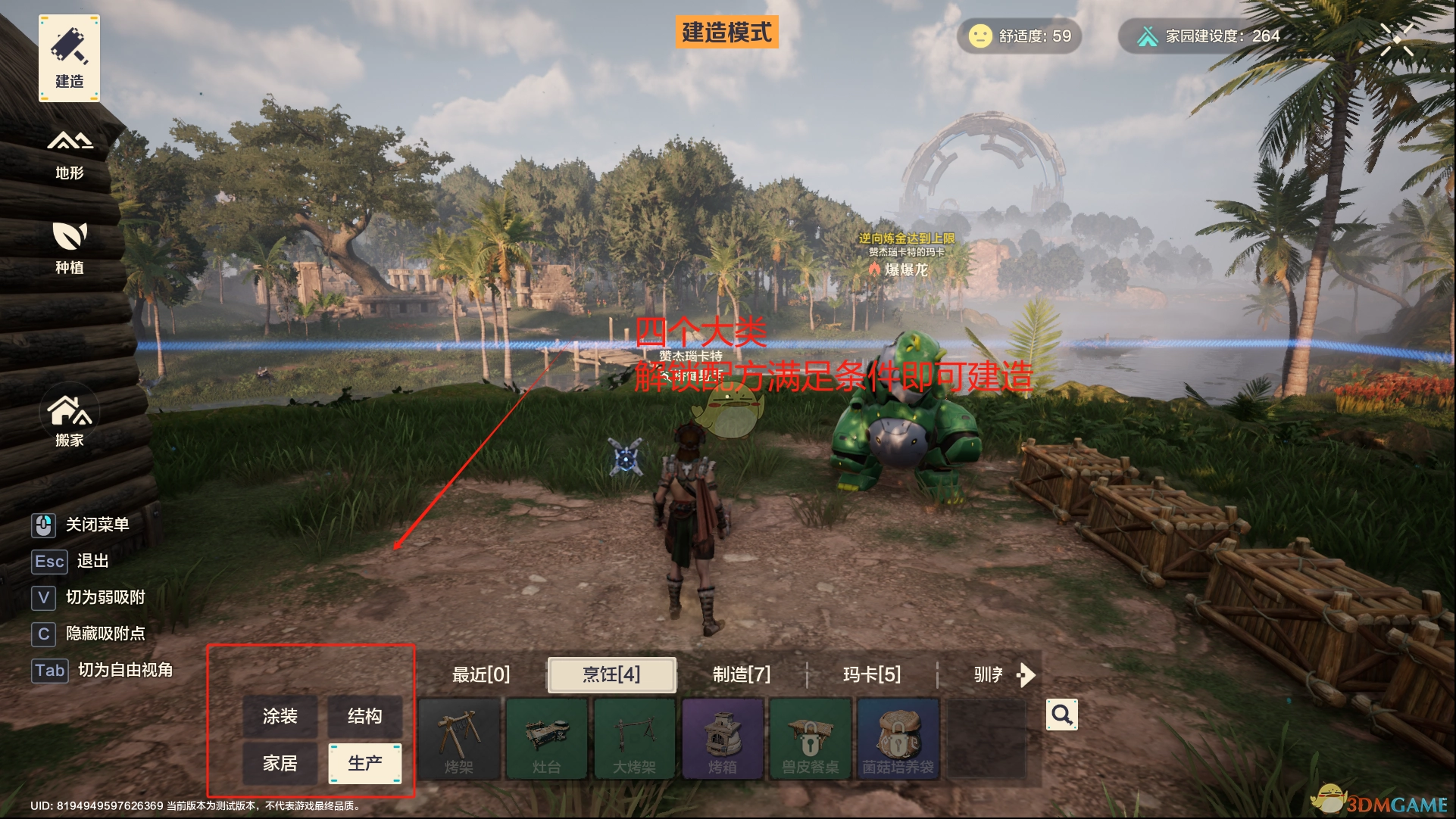 当玩家进入建造模式,就能从涂装、结构、家居、生产这几类中挑选想要建造摆放的物品。只要解锁相关配方,并满足物品的材料需求,就能够进行建造。