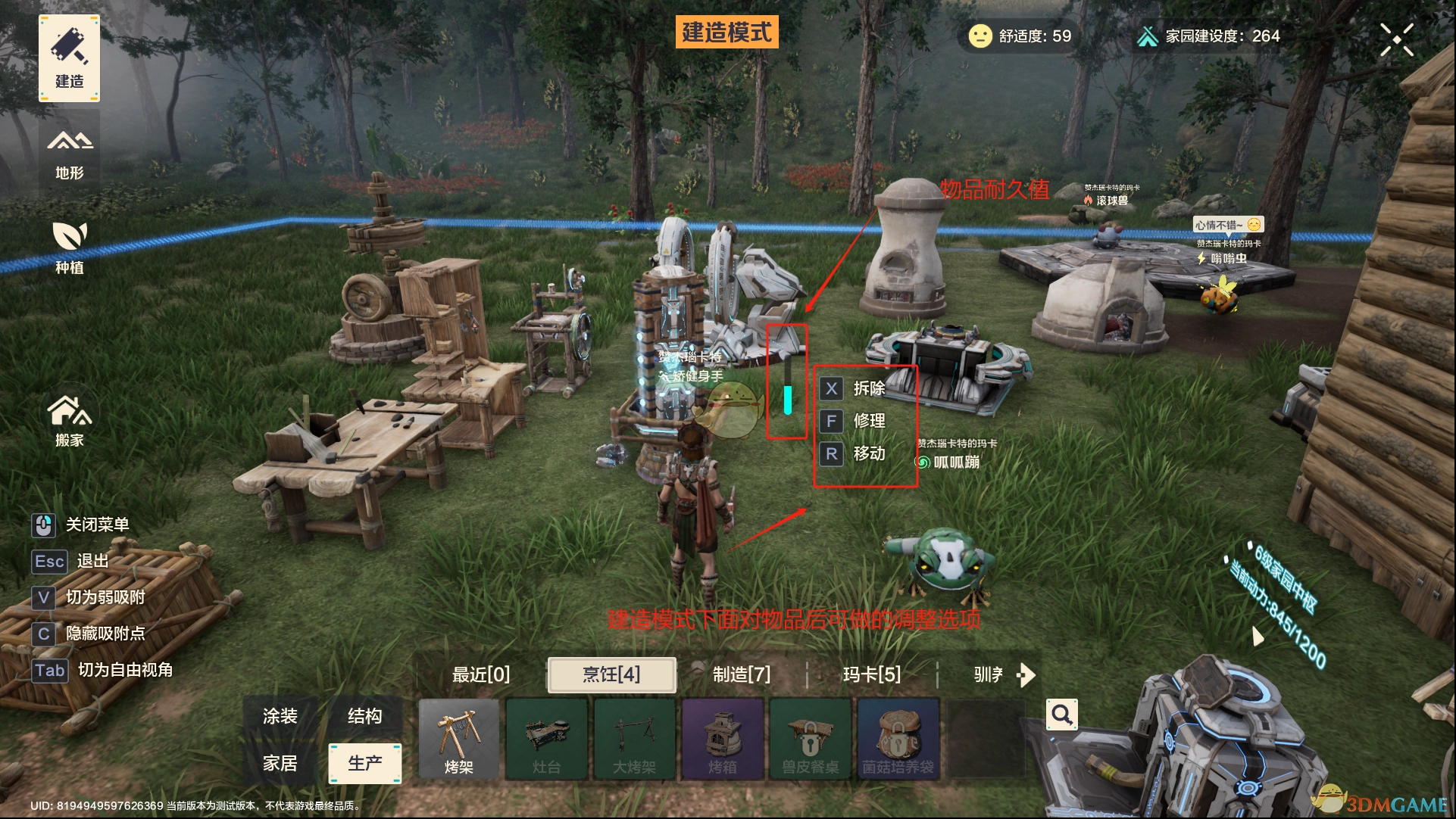 所有建造出来的物品均具备耐久值。已摆放好的物品(如家居),能够在建造模式下进行拆除、修理或者移动操作。
