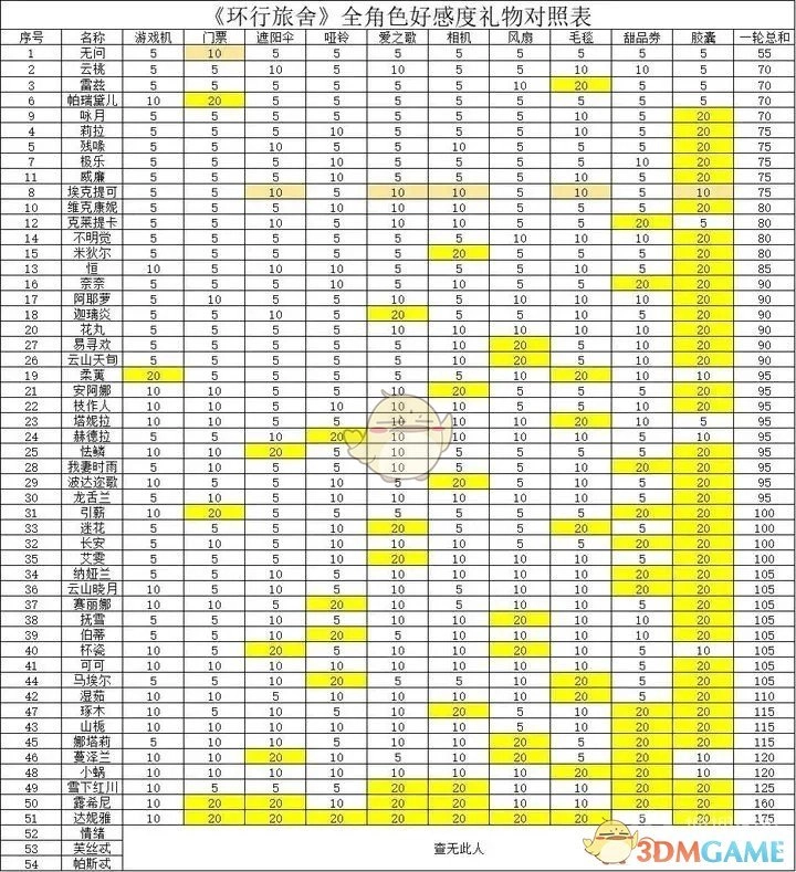 1、以下表格是依据好感度提升由难到易的顺序排列的,玩家依照该表格送礼就行。