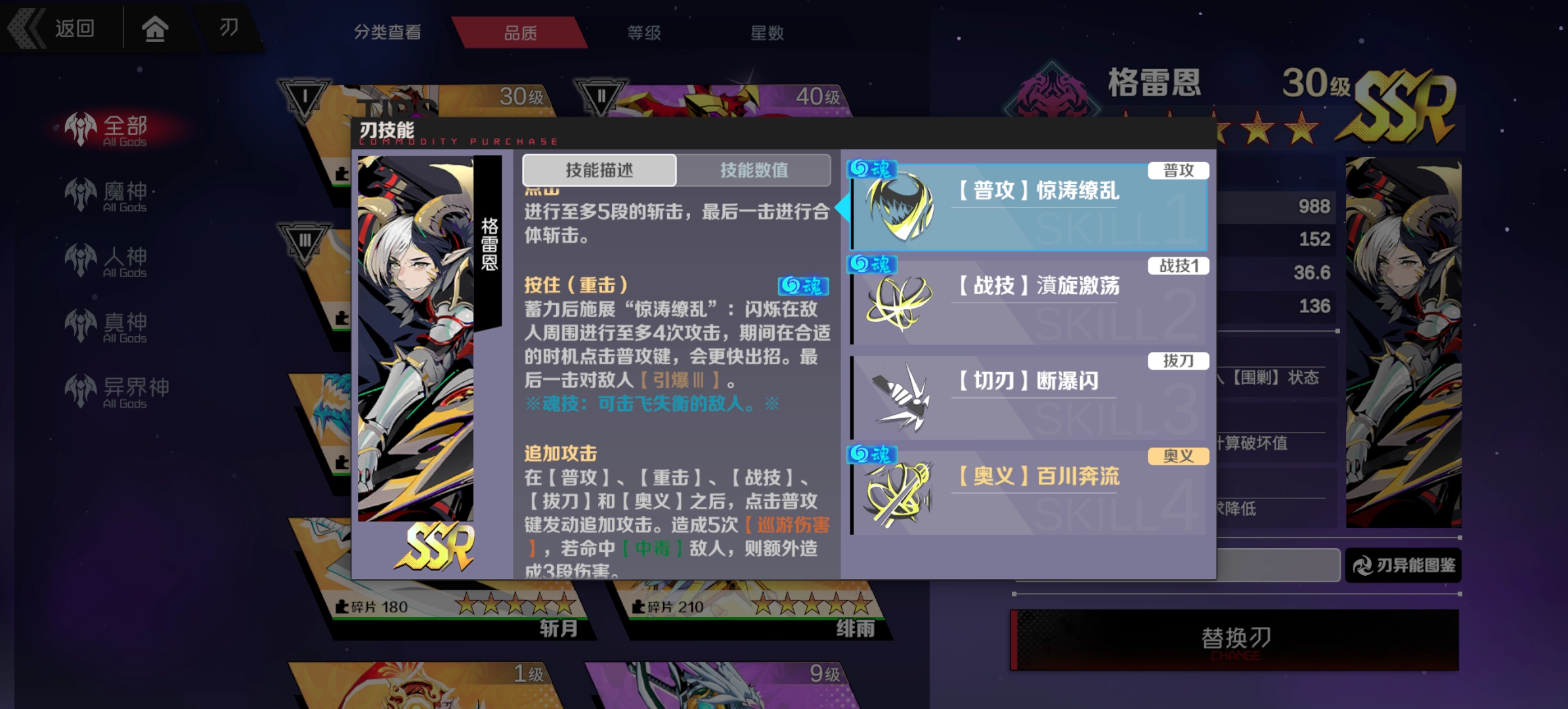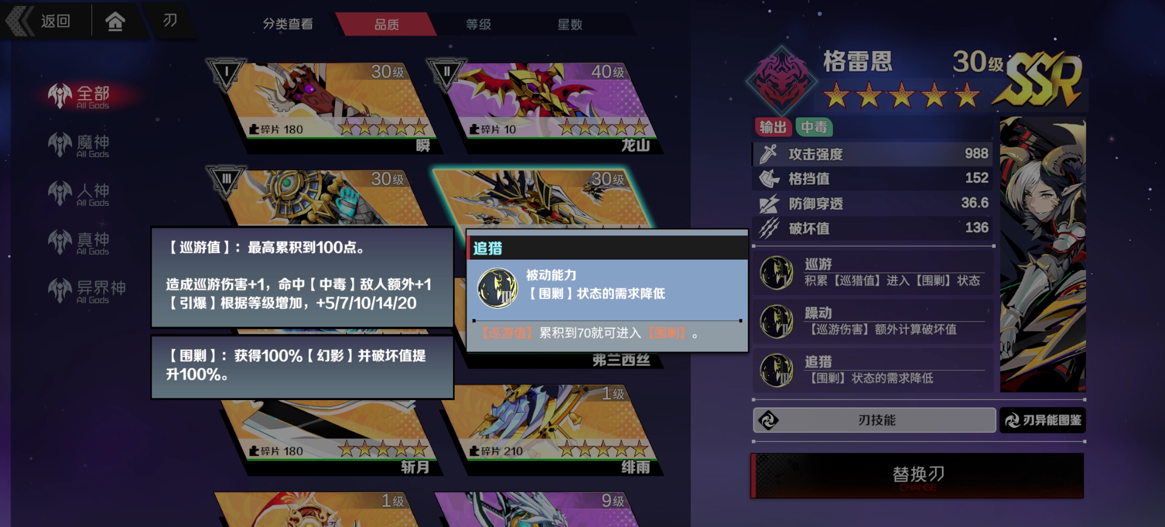 毒系主C,斩月之外仅有的UP主C。鉴于在设定中,UP刃本就强于普通刃,格雷恩自然实力不俗。其强大的0星被动,使得无论是攻强流还是破坏流,都能玩得转。