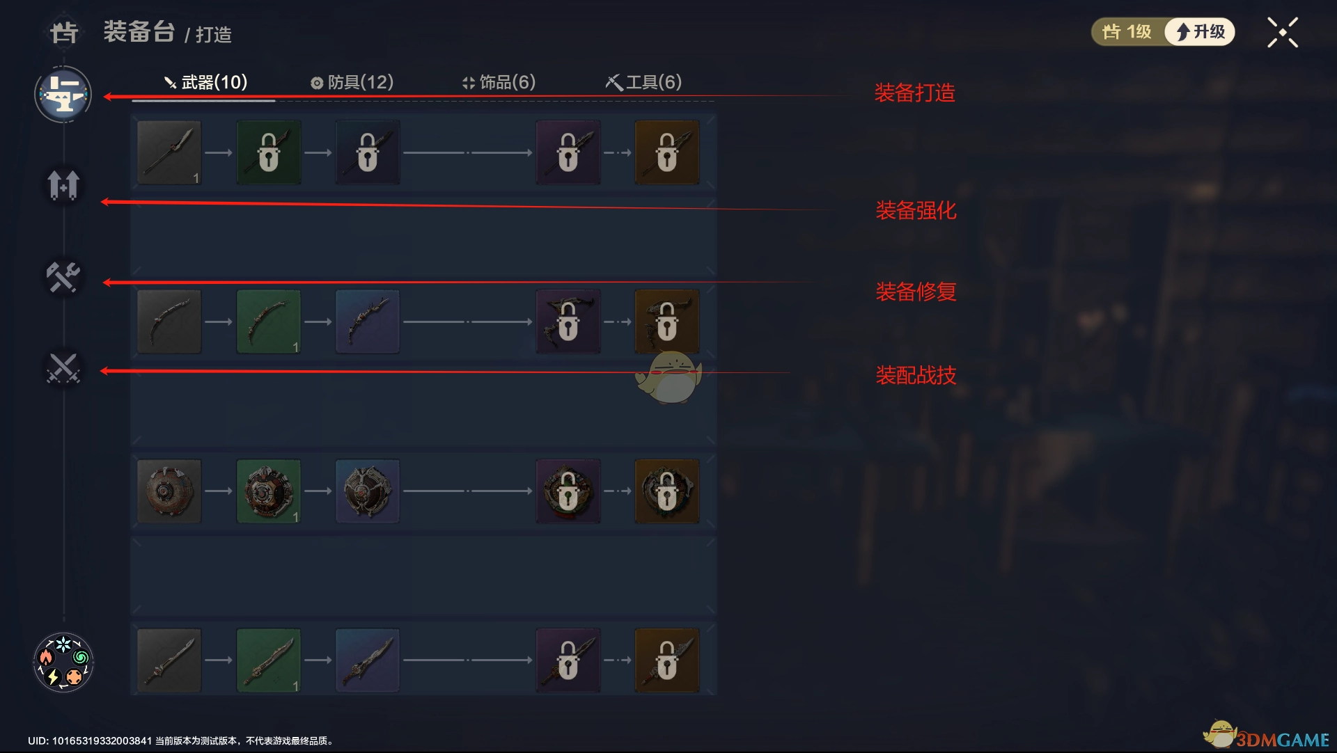 还有一点至关重要,大家务必优先建造装备台。武器、防具、饰品以及生活采集中的关键工具,皆在此处制作。此外,功能强大的装备台还自带修复耐久与装备强化功能,其优先级极高哦!