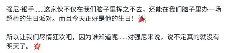 强尼·银手啊,这家伙就像在你脑袋里安了家,还不付一分房租,而且还能冷不丁就来一场狂欢派对。嘿,今天可是他的生日呢!咱们就尽情撒欢儿,就当明天不会来临——毕竟有强尼在,明天还真没准儿就没了!