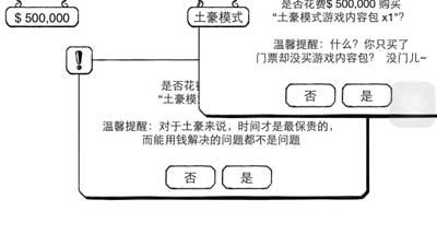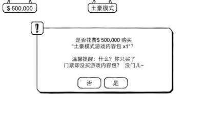 开启土豪模式后,就会要求你购买门票。游戏初始给了1,000,000,可门票价格高达5,000,000,这几乎直接花掉了一半。而且看起来要是不买还不让继续,没办法,只能买了。