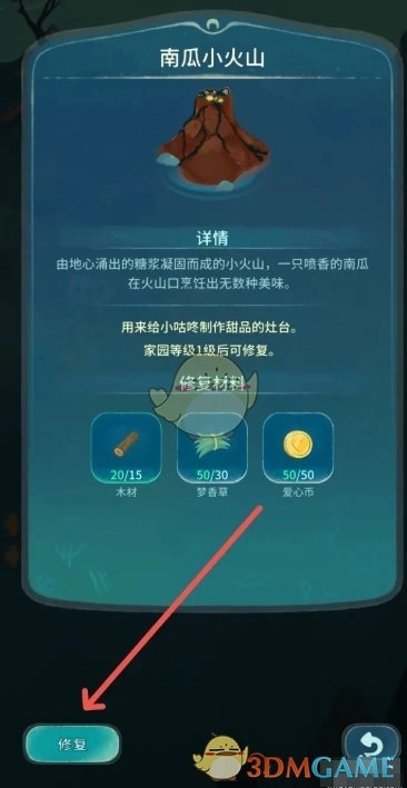 3、待材料全部集齐后,点击页面左下角的“修复”按钮,随后等待南瓜小火山完成修复。