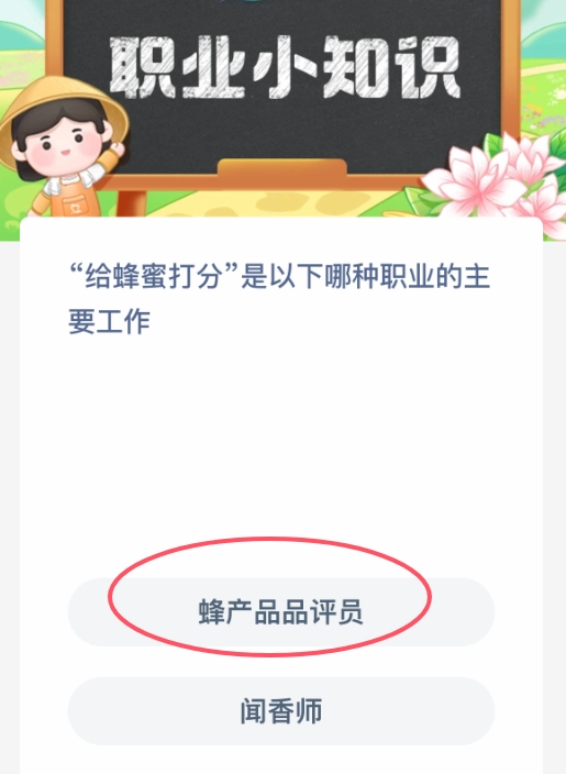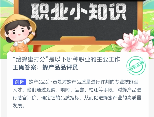 以下哪种职业的主要工作是“给蜂蜜打分”呢?这是2025年2月11日支付宝蚂蚁新村的题目,正确答案为【蜂产品品评员】。蜂产品品评员属于专业技能型人才,其职责是对蜂产品质量进行评判。