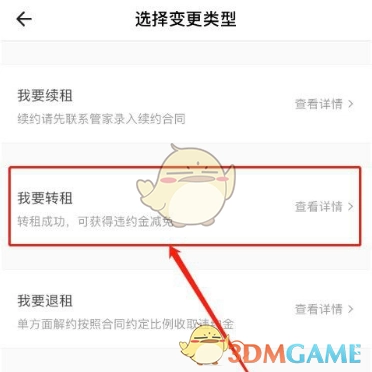 4、进入租约变更功能界面后,在相关选项中选择“我要转租”,具体位置可参照图示。