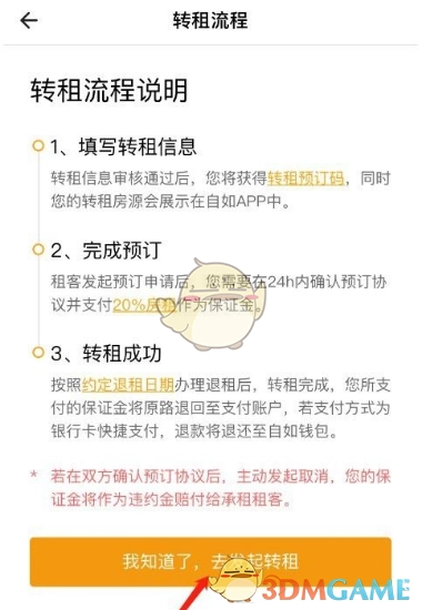 5、随后便会进入转租流程,确认无问题后,点击下方的“我知道了,去发起转租”,具体位置如图所示。