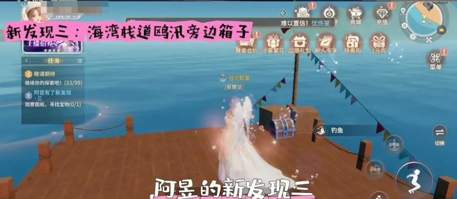 阿昱的第三个发现同样是箱子,此箱子位于海湾栈道欧讯附近。玩家需前往海湾栈道,找到欧讯旁边的箱子并直接打开,此时便会发现第三个任务已完成。当玩家集齐三个发现,即意味着完成任务,届时玩家将获得金币、经验值、道具等丰厚奖励。