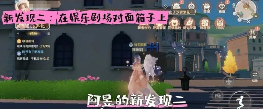 阿昱在游戏里有了新发现,他找到了三个全新的地点。此时,玩家需要帮他找到这三个地方,并完成相应任务,如此便能获得奖励。阿昱的第一个发现,是要来到钟楼旁,仔细观察周边环境,这样就能找到阿昱所说的第一个发现之处。