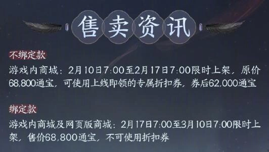 2、售价68.800通宝的绑定款,不可使用折扣券;而不绑定款可使用专属折扣券,券后价格为62.000通宝。