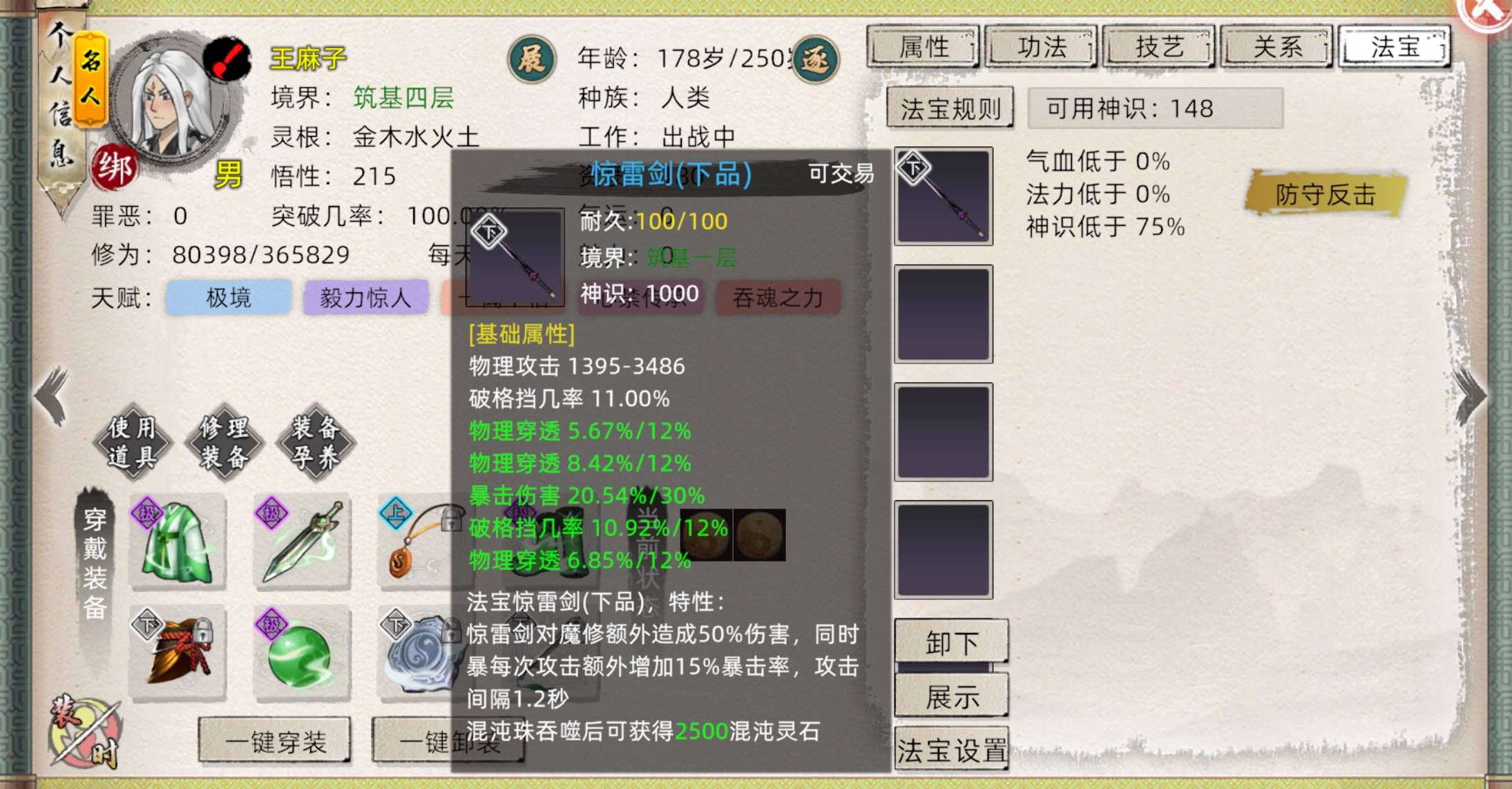 我们通过点击头像进入法宝界面,然后装备上自己炼制的法宝。需要留意的是,每件法宝都要消耗神识并占用一定的神识上限。要是神识上限无法满足该法宝的需求,即便装上法宝也等同于未装。就好比我的惊雷剑,便会消耗1000点神识上限。