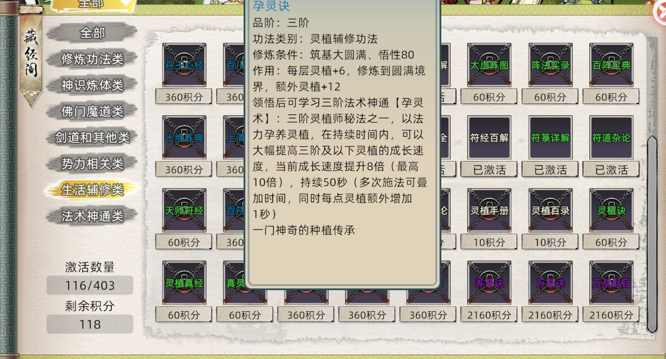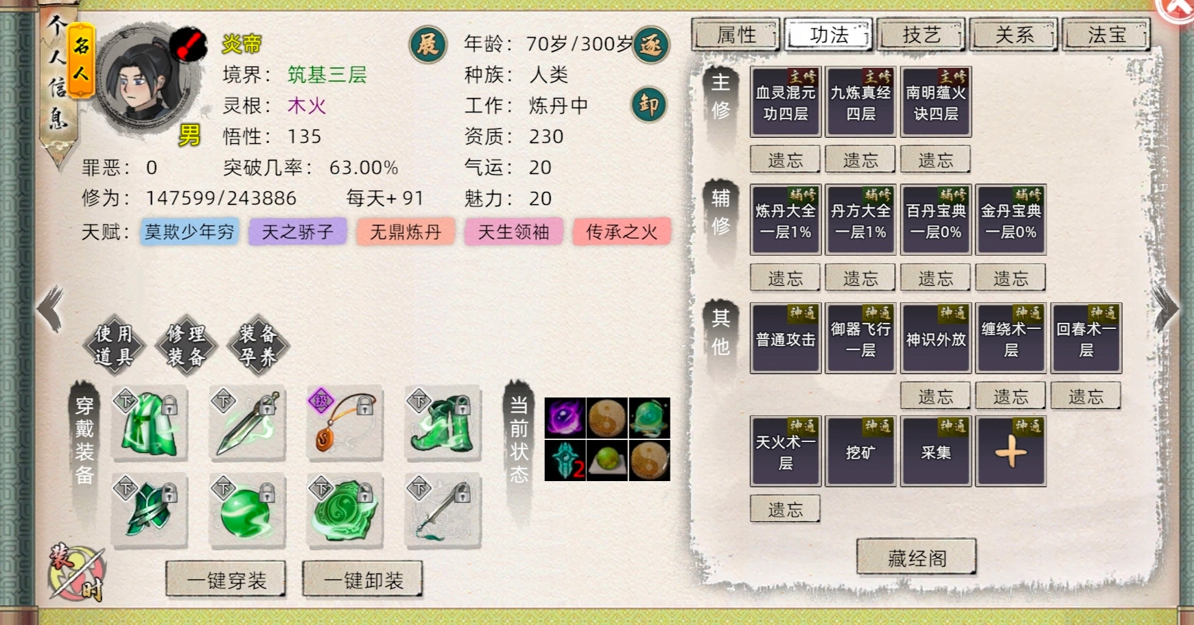 在藏经阁,生活辅修类包含炼丹、炼器、炼阵、炼符、灵植等辅修功法。与此同时,五种灵根各自对应的主修功法,也伴有各类生活技艺加成。具体而言,火灵根对应炼丹,木灵根对应灵植,土灵根对应炼阵,水灵根对应制符,金灵根对应炼器,这些均以提升辅修属性为主要目的。所以,我们可直接找拥有对应灵根的弟子,学习相应的技艺功法。