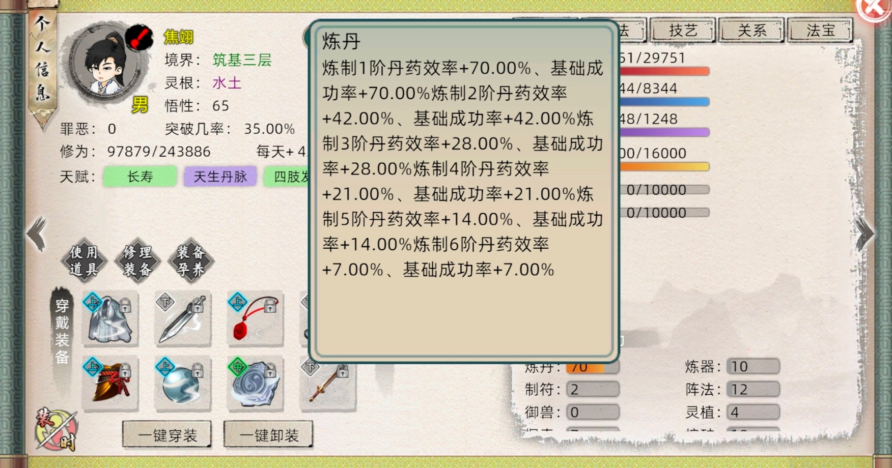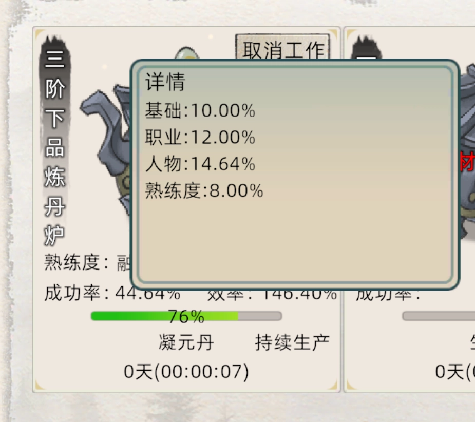 以一阶修为丹为例,炼丹属性每增加1点,基础效率与基础成功率会提升1%。此处所指的提升1%,并非是直接在成功率上累加1%,而是按照成功率×(1 + 提升率)的方式计算。例如,若当前提升率为100%,基础成功率为10%,经计算后,基础成功率变为20%。效率以及其他技艺的计算方式与此同理。
