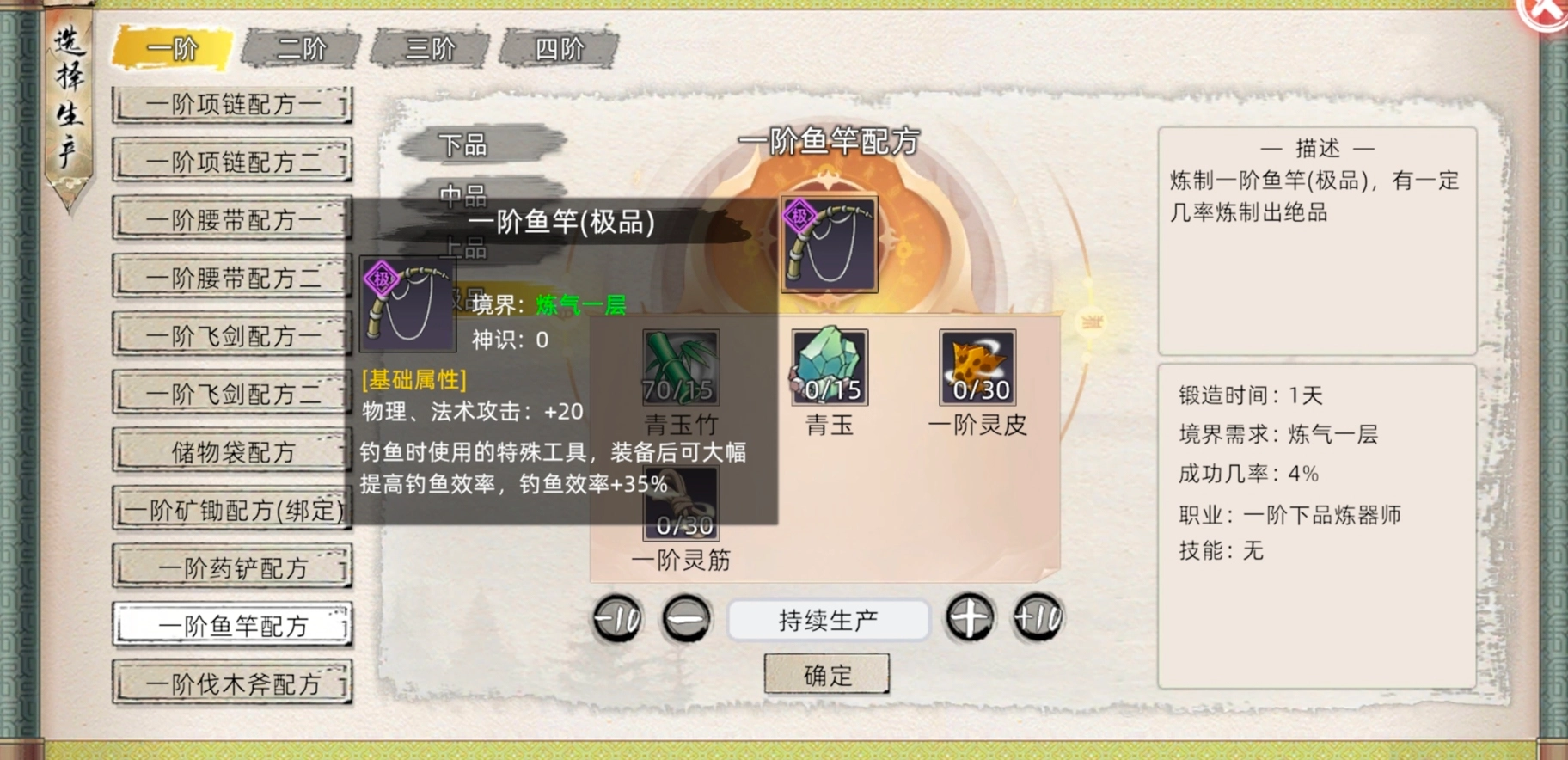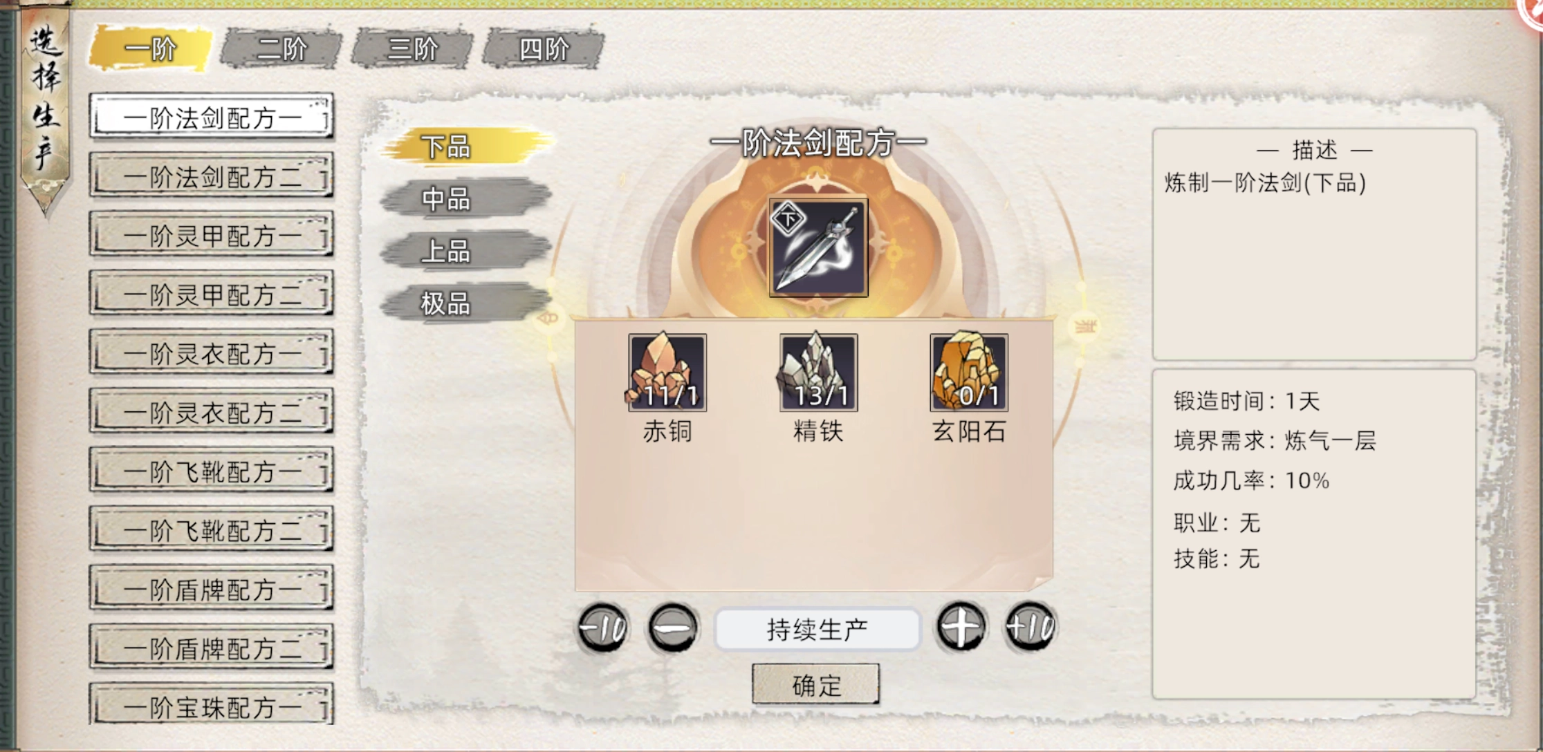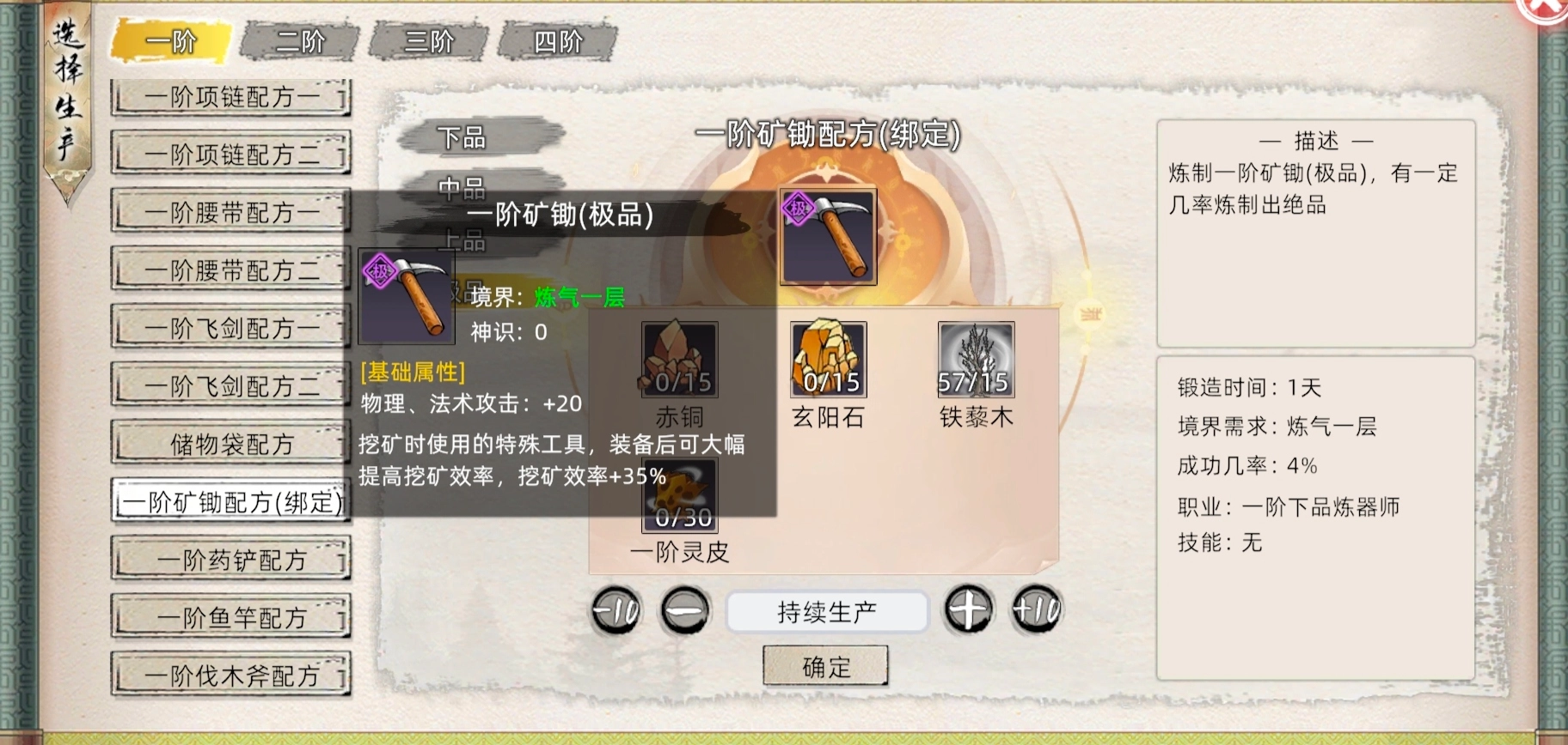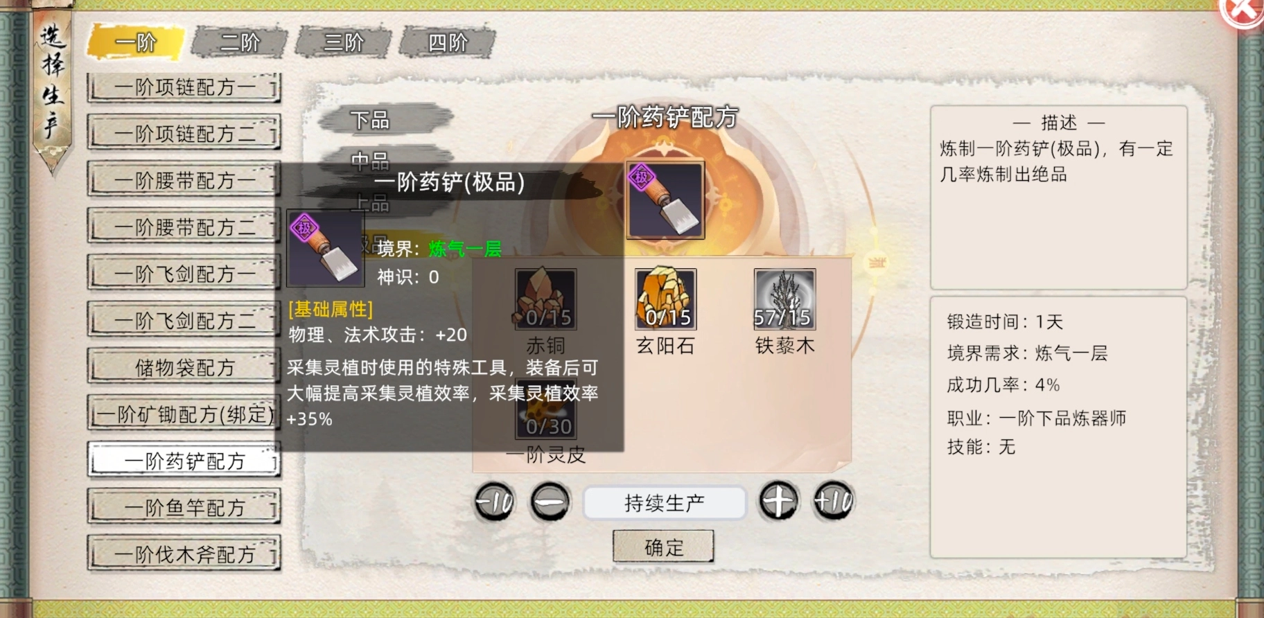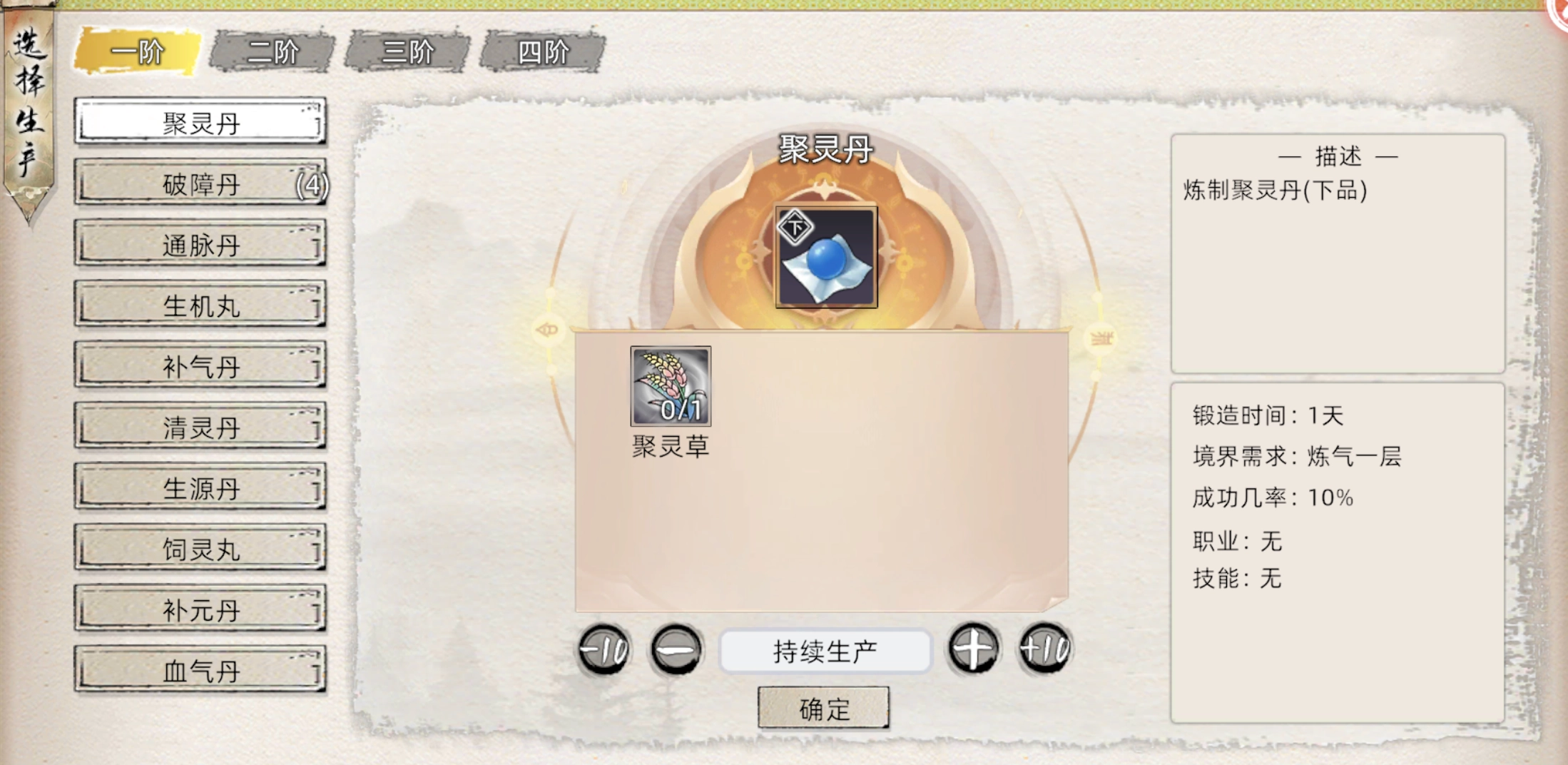 右下角该丹药的基础成功率(10%)与基础时间(1天)和职业要求,下方为你想练多少颗,持续生产则是练完草药为止,每次成功炼制会随机获得各种品质的该丹,炼丹属性越高,高品率越高。